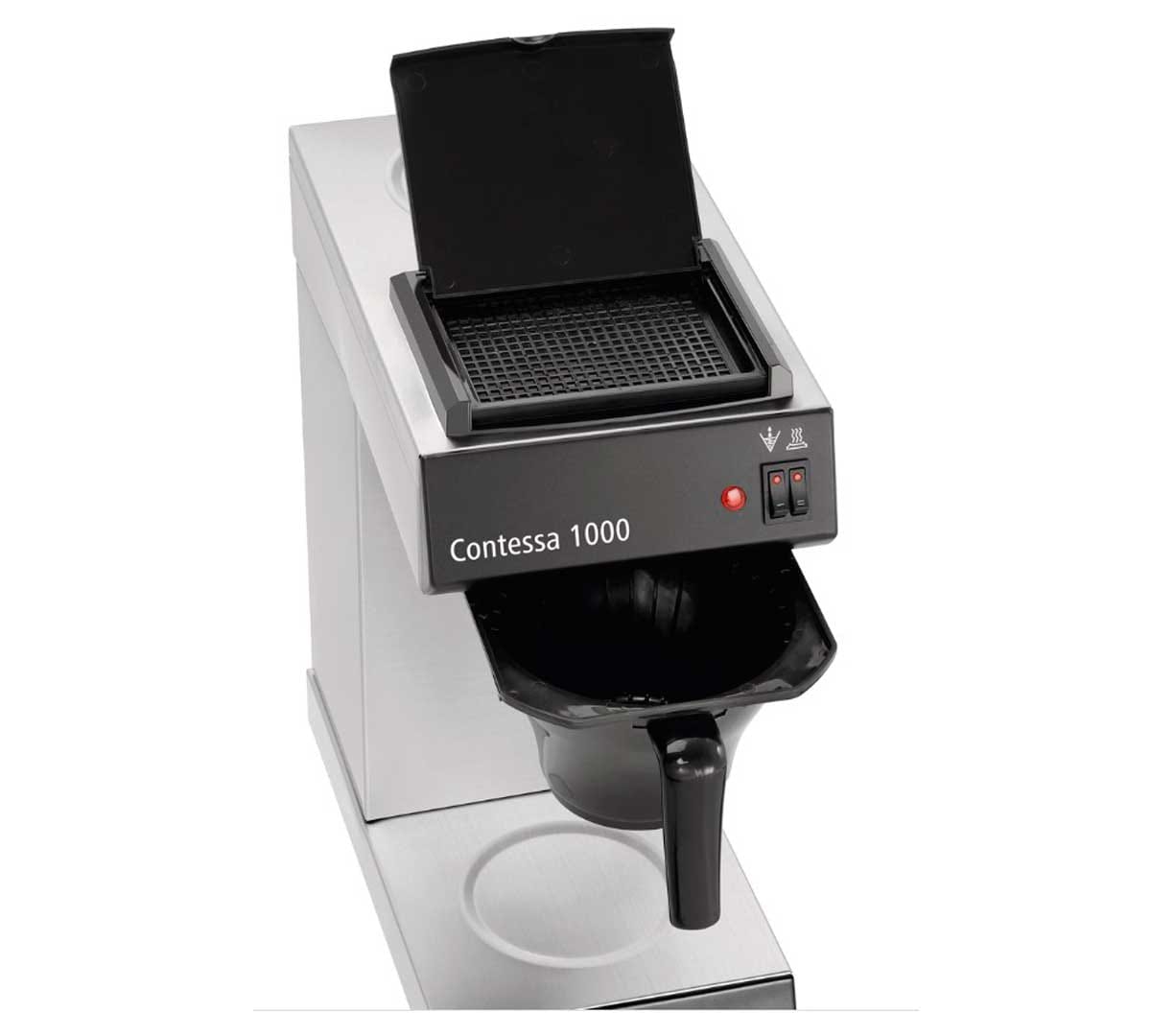 La Máquina de Café Contessa 1000 de Bartscher pueden preparar hasta 11 tazas de café en la jarra de vidrio de 1,8 litros. El café se puede mantener caliente en la placa calentadora conmutable por separado que tiene en la parte superior. Diseñada para preparar café con el uso de un filtro (no incluido) y agua fría.