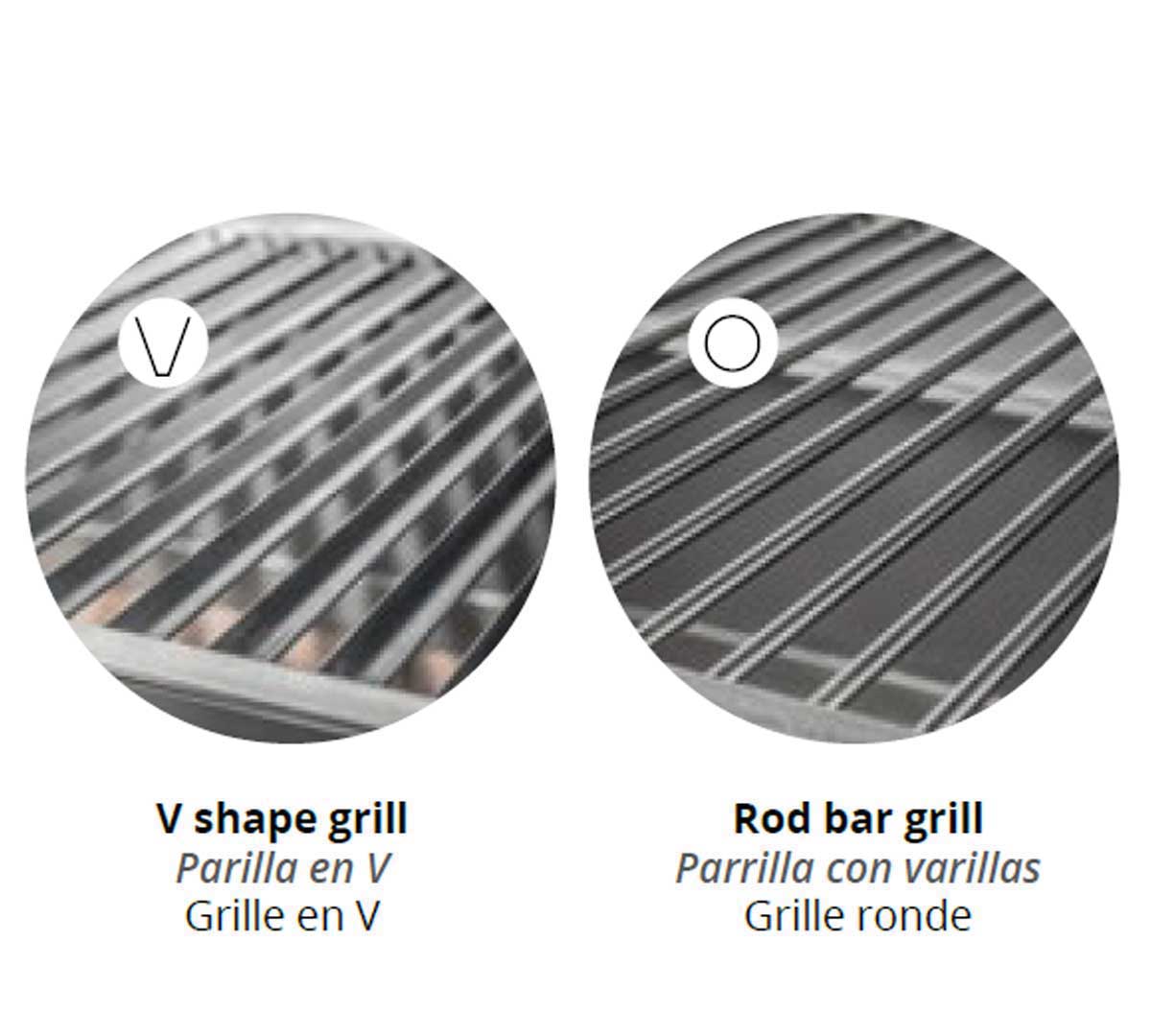 P858101, parilla  en forma de V que canaliza la grasa y los líquidos lejos de la fuente de calor para una mejor retención del sabor.