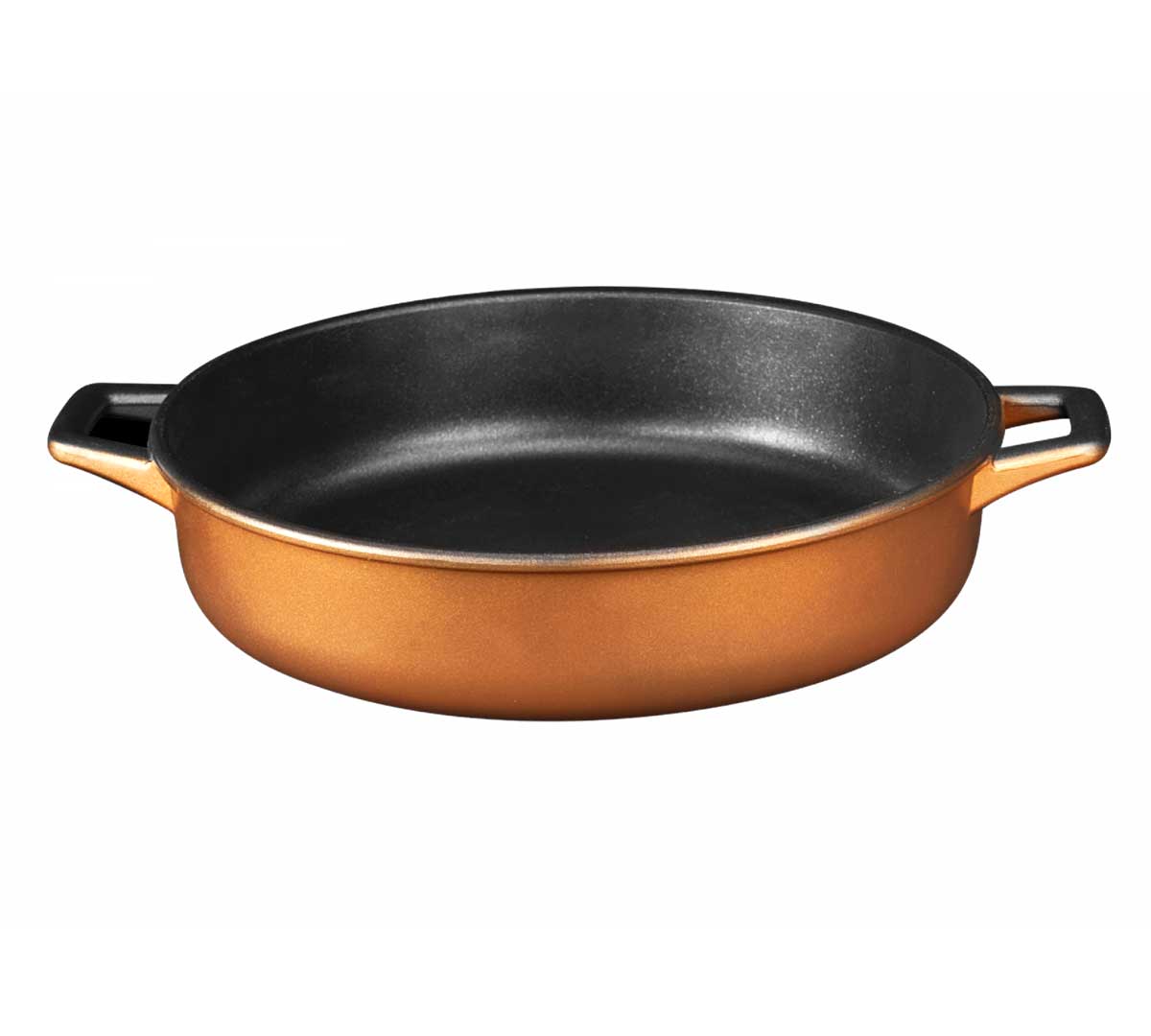 Esta cazuela baja forma parte de la gama de aluminio fundido de color bronce. Puedes ampliar esta colección añadiendo cazuelas altas y rustideras.