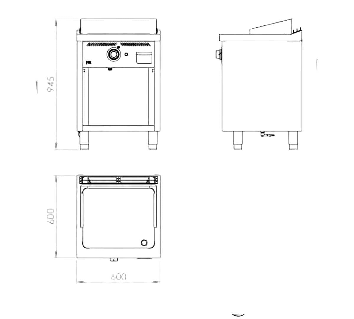 Plancha fry-top a gas de pie de la serie 600. Tiene termopar de seguridad. La placa es lisa, está fabricada en acero rectificado y tiene un espesor de 15 mm. Las patas son de acero inoxidable y regulables. Con cajón recoge grasas extraíble.