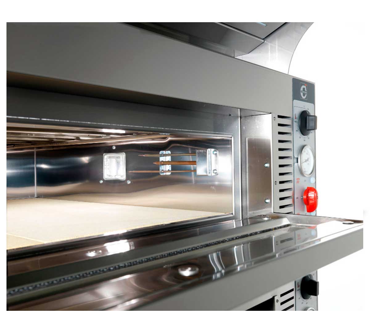 Tiene 1 cámara de cocción de acero inoxidable. El suelo de la cámara de cocción es de material refractario de cordierita.