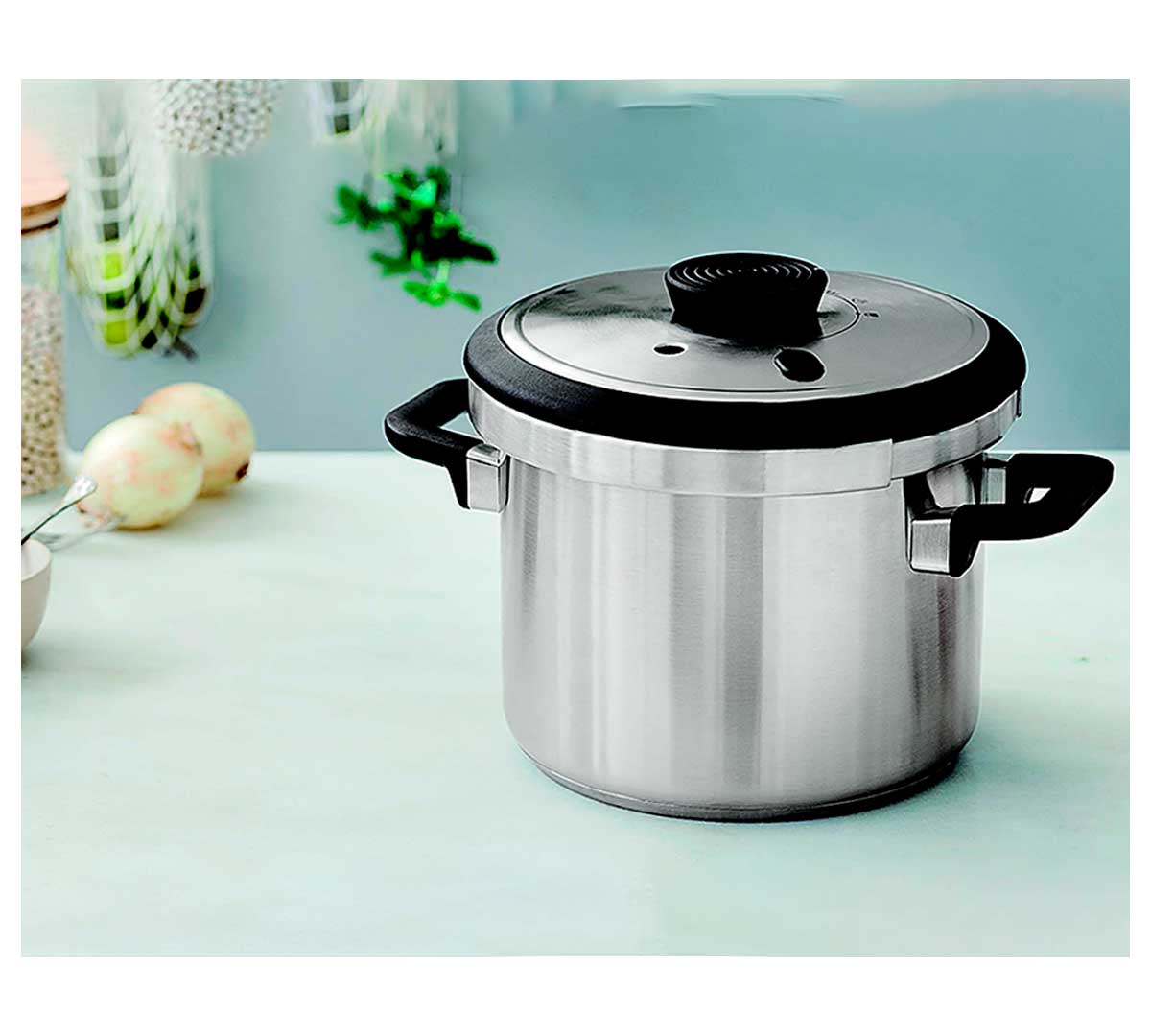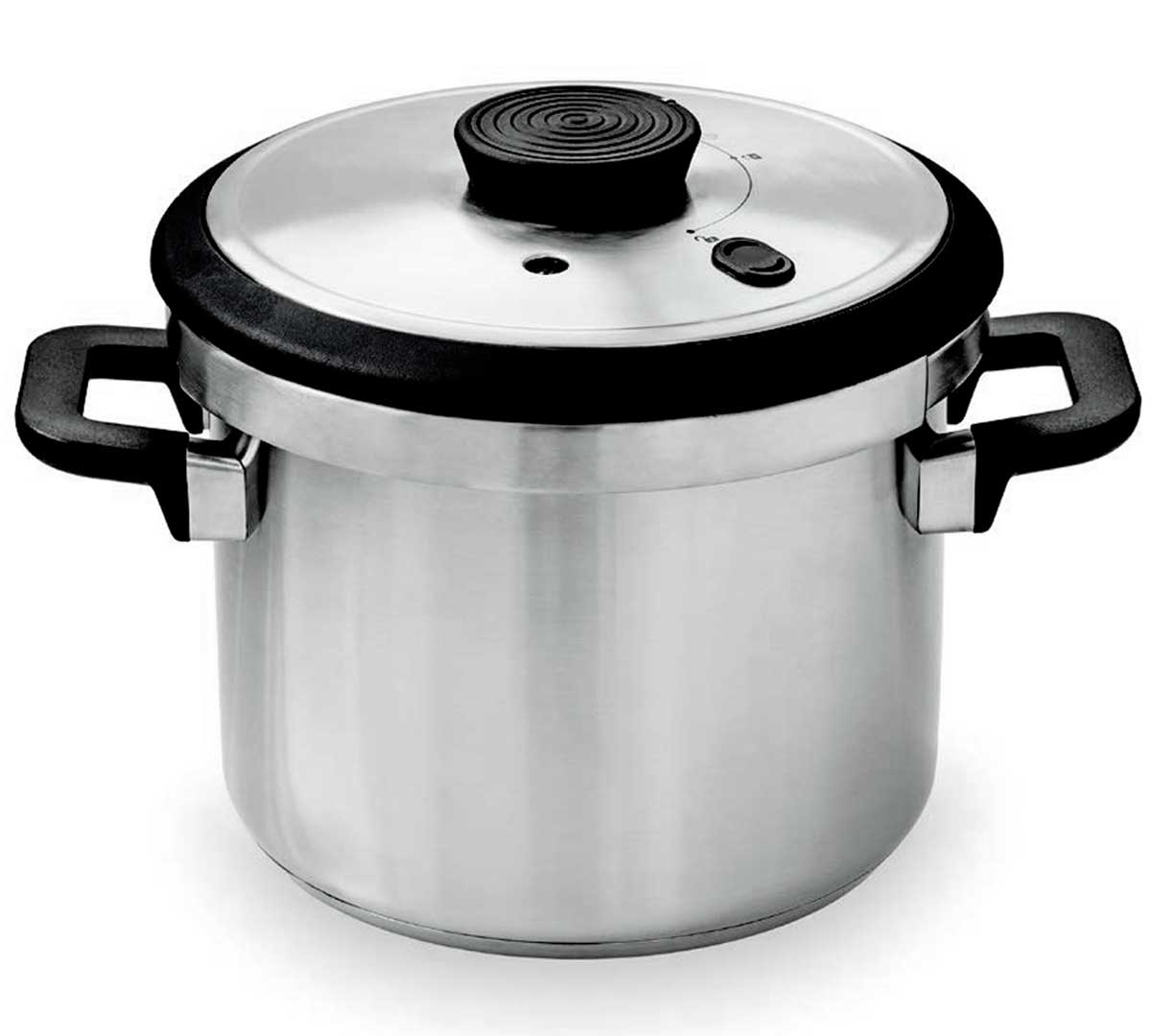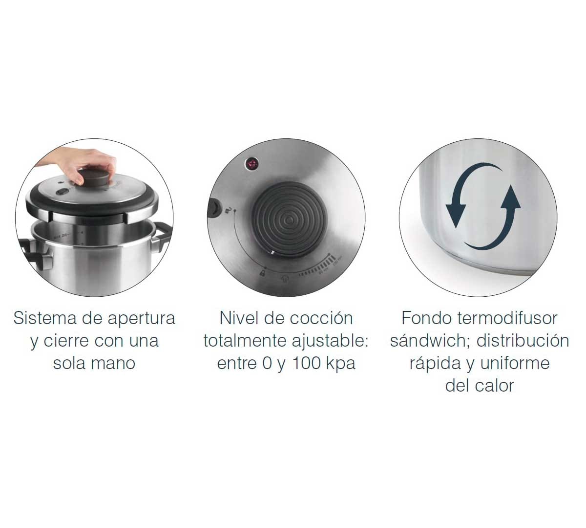Esta olla a presión está diseñada con un sistema de apertura y cierre con una sola mano. Está disponible en tres tamaños.