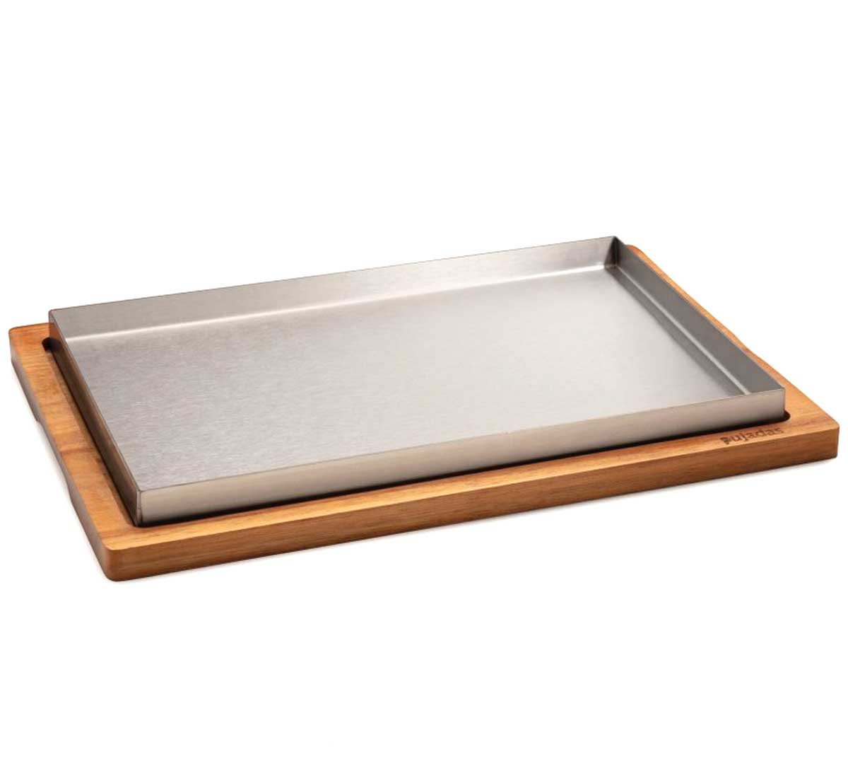 La Llauna Rectangular con Base de Madera de Pujadas es ideal para arroces, caracoles, carnes y pescados al horno. Permite una presentación original y vistosa, la bandeja llauna viene acompañada de una bandeja de madera como complemento para llevarla directamente a la mesa.