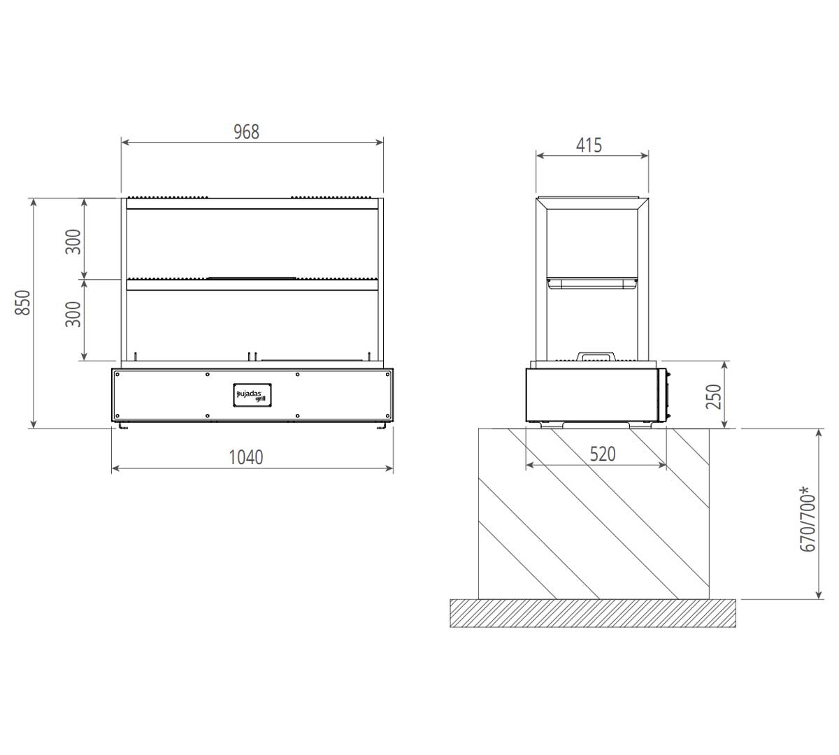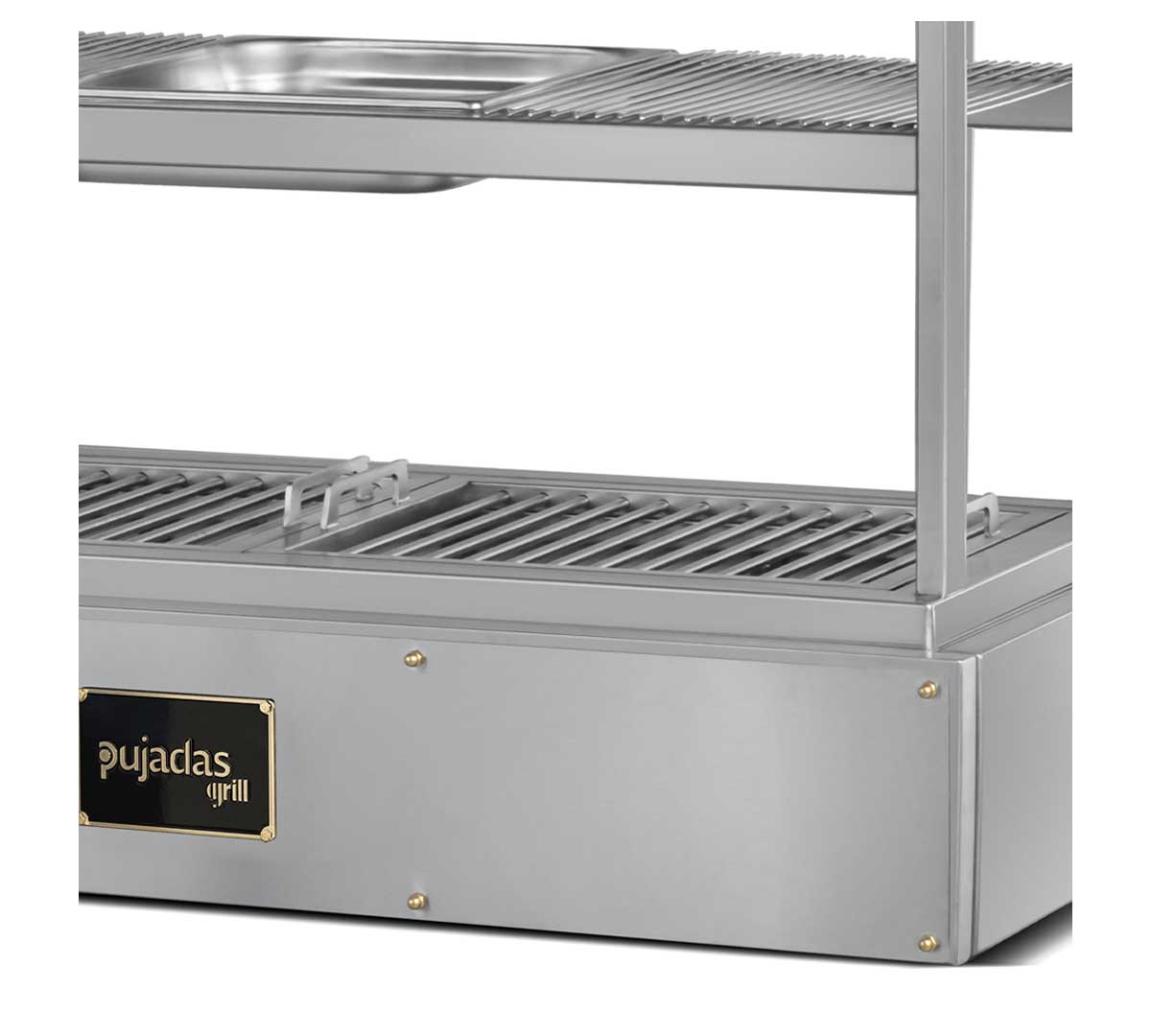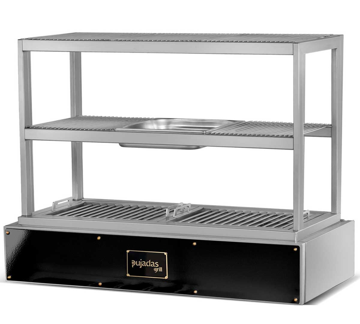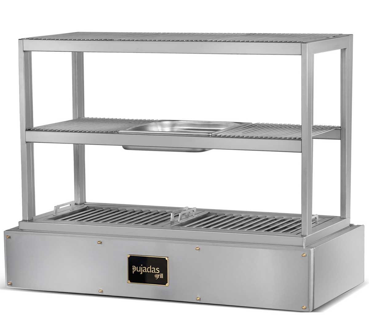 La Robata de Sobremesa de Pujadas tiene un diseño de parrilla abierta que cuenta con 3 niveles de cocción y 5 rejillas móviles que ofrecen flexibilidad para cocinar diferentes cocciones e ingredientes. Incluye 2 parrillas de varilla extraíbles y 1 cubeta GN 2/3 con una profundidad de 6,5 cm. Es perfecta para cocinas con espacio limitado.