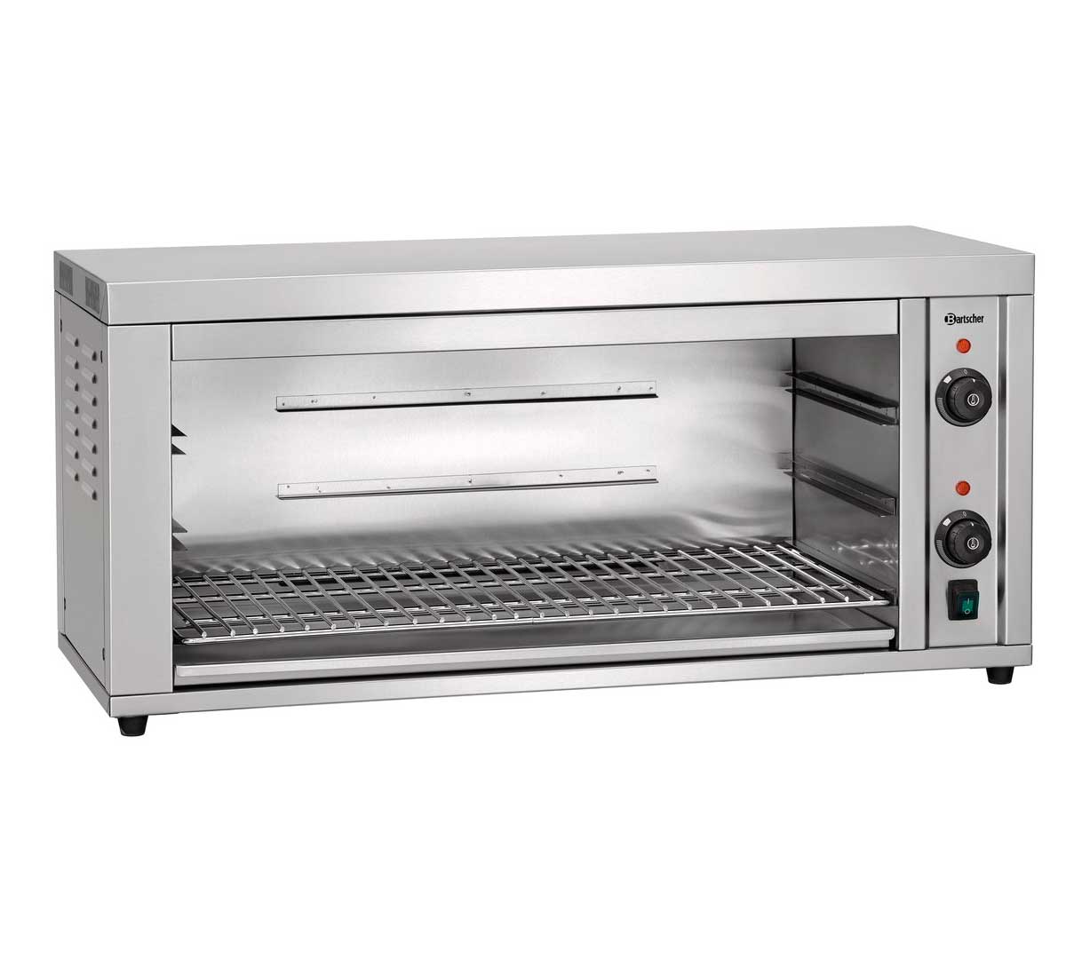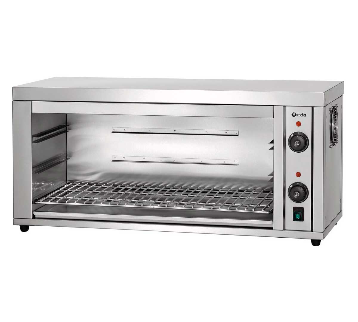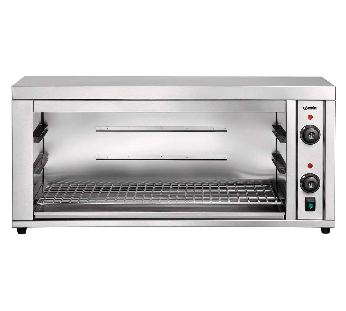 La Salamandra 700-2Z de Bartscher destaca por la facilidad de manejo de las dos zonas de calentamiento y sus eficaces elementos calentadores radiantes. La rejilla de parrilla se puede insertar en tres alturas diferentes.