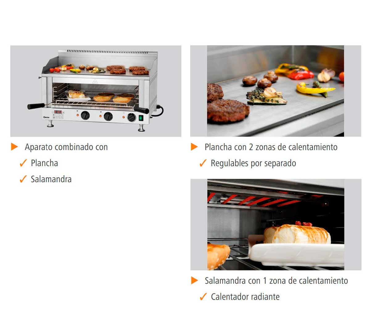La Salamandra Grill 6640 de Bartscher combina plancha y salamandra. La plancha tiene 2 zonas de calentamiento que se pueden encender por separado. El suministro de calor de la salamandra se puede adecuar mediante la rejilla regulable en altura y la temperatura ajustable de forma continua. Con temporizador digital.