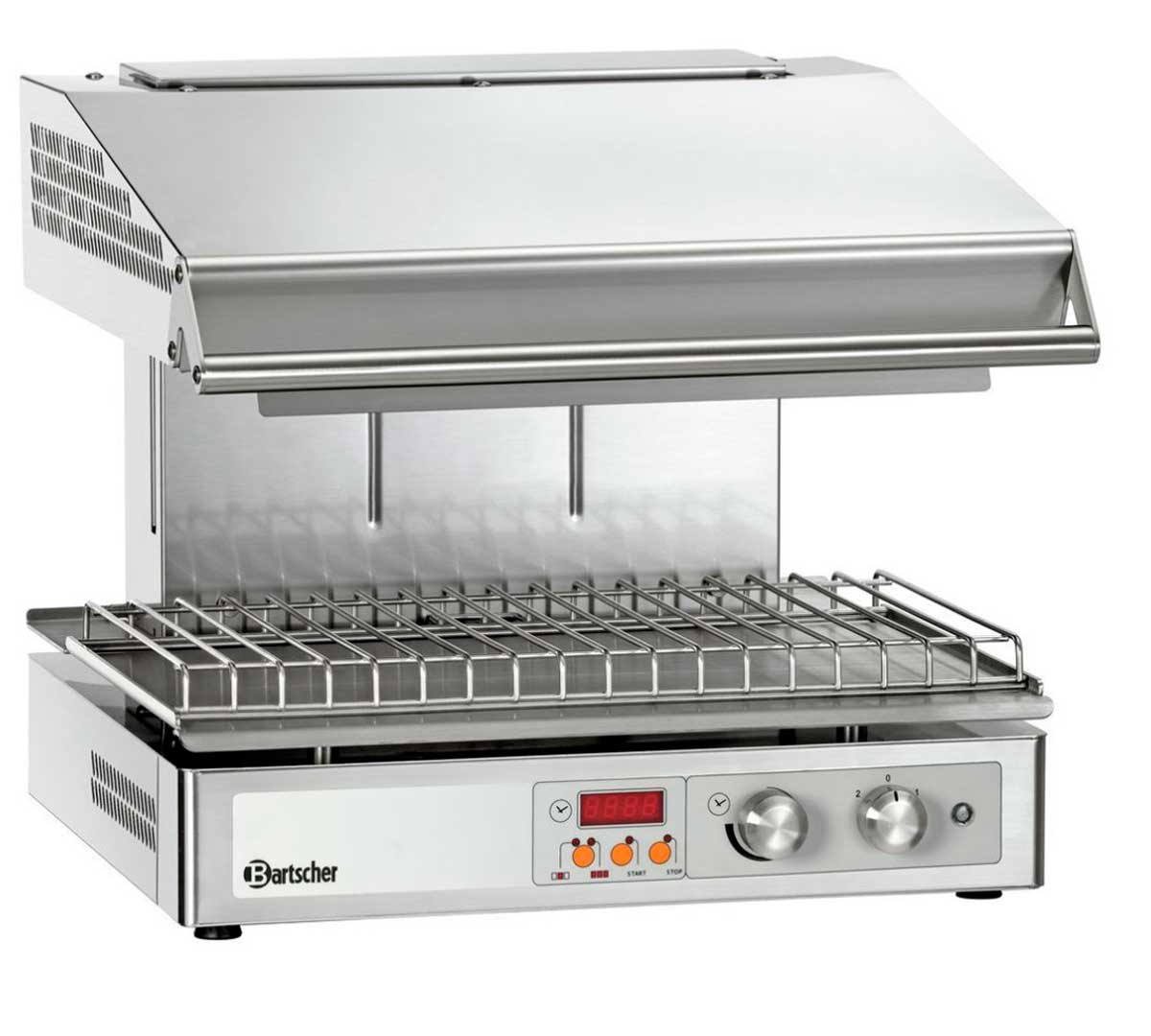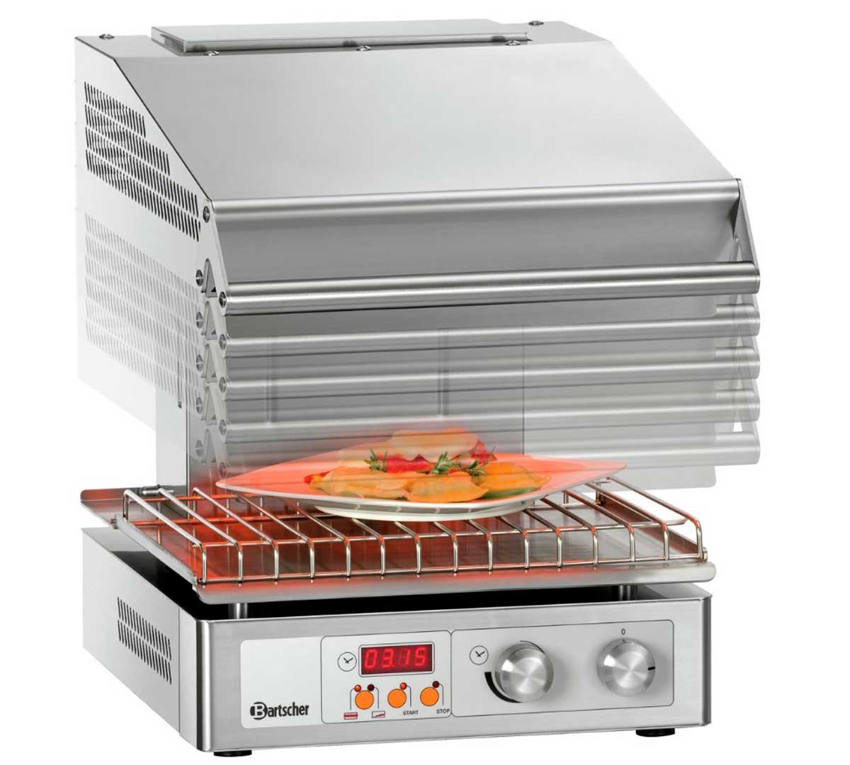 La Salamandra Hi-Light Lift de Bartscher tiene 2 zonas de cocción que se regulan independientemente. El cabezal es regulable en altura.