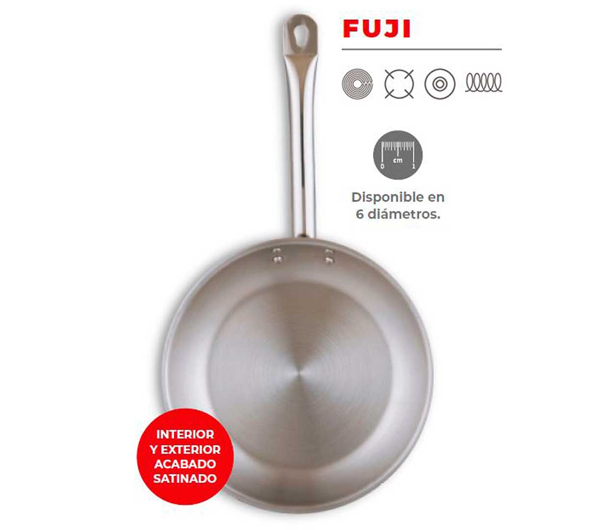 La Sartén Fuji de Comas está fabricada en acero inoxidable. El mango también es de acero inoxidable. Con fondo termodifusor sandwich con 2 capas de acero inoxidable y 1 capa de aluminio.