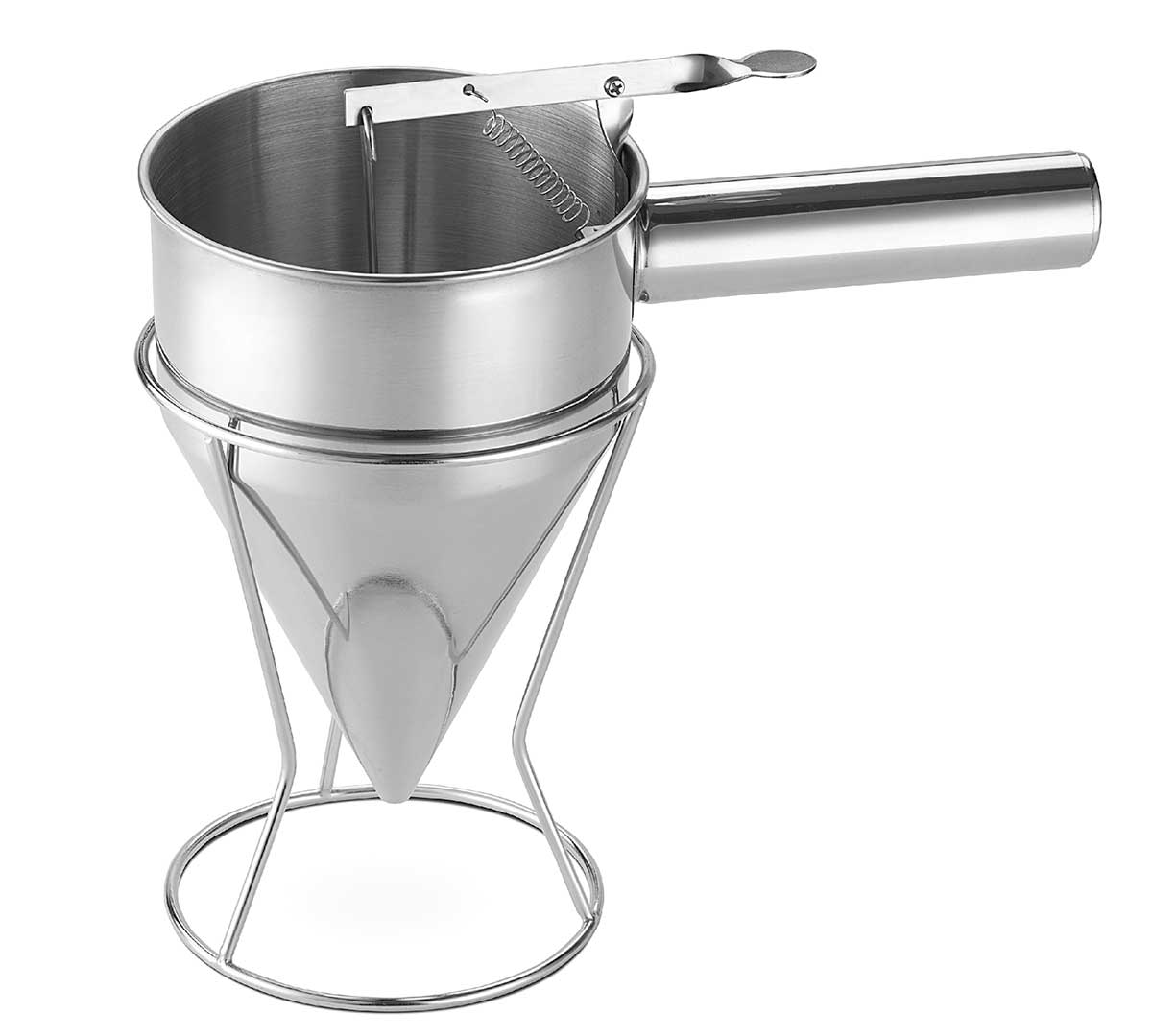 Embudo dosificador de acero inox con soporte incluido. Tiene una capacidad de 1 litro. Está recomendado para servir y dosificar cremas, salsas para rellenos, platos decorados o blinis.