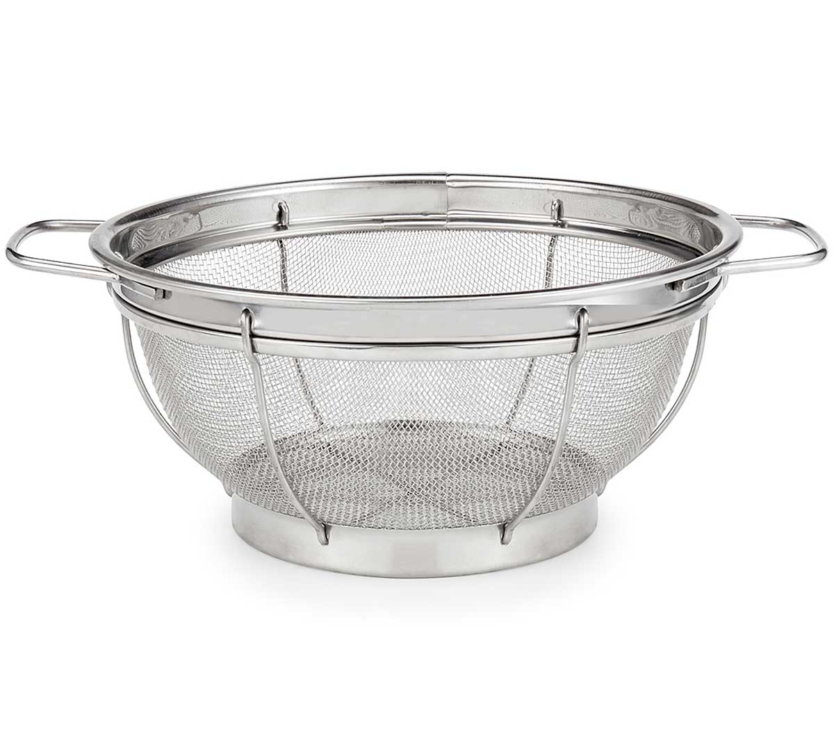Escurridera de malla fabricada en acero inoxidable. Está disponible en tres tamaños con diámetros desde 25 hasta 40 cm.