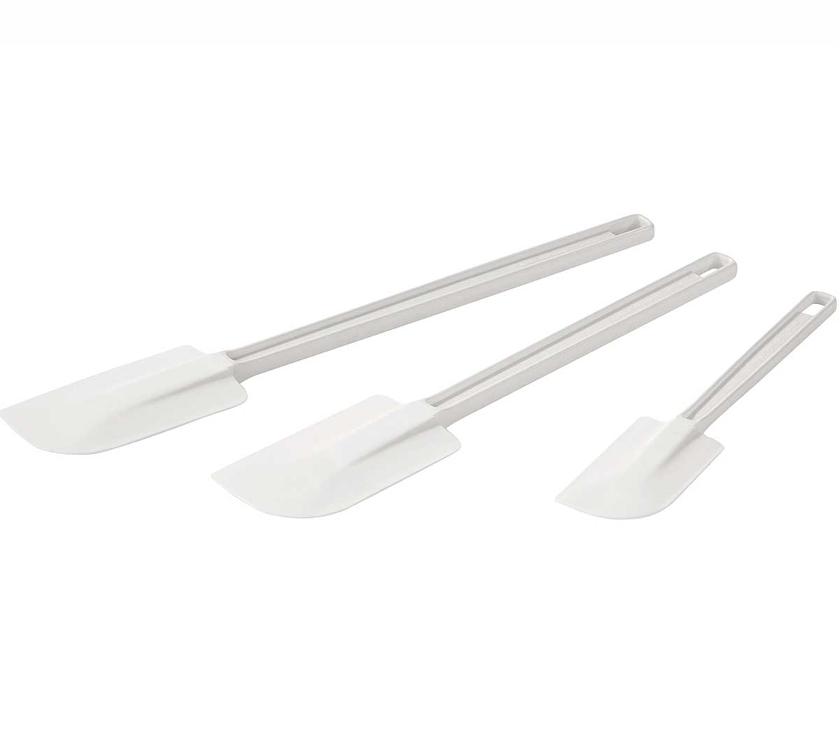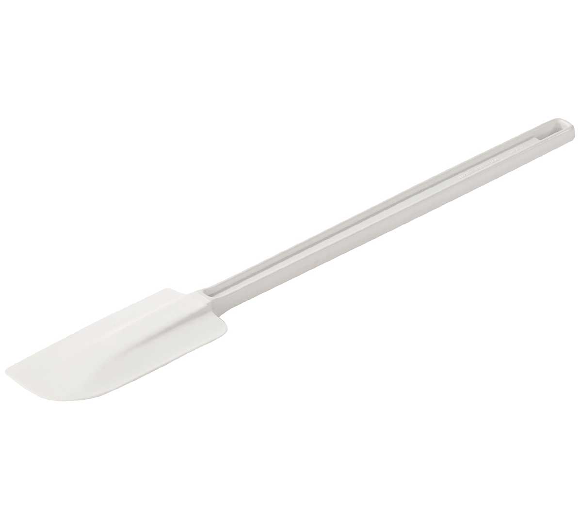 Espátula de goma uso alimentario en pastelerías. De color blanco, ideal para retirar restos de cremas o masas con mayor eficiencia. Está disponible en tres tamaños, de 25,5 a 41 cm. Puede lavarse en el lavavajillas, tiene un moldeado especial que previene la separación de la goma del mango.