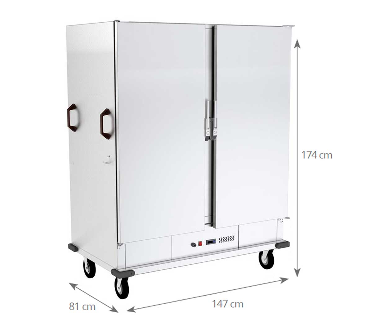 Carro mantenedor de temperatura ideal para catering y banquetes. Permite asegurar la máxima calidad y la entrega de los platos por encima de los 65 ºC. Funciona mediante la circulación uniforme y constante del aire gracias a un sistema único que imposibilita el contacto de las cubetas con el fondo o las paredes. Tiene capacidad para 44 bandejas GN 2/1 u 88 bandejas GN 1/1 con una altura máxima de 5,5 cm. Incluye recipiente humidificador.
