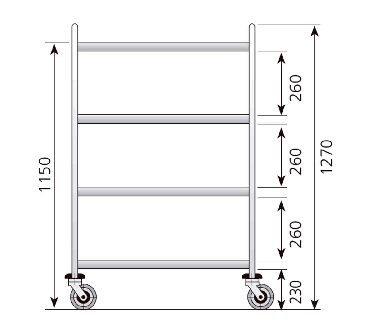 Equipado de 4 ruedas giratorias con un diámetro de 12,5 cm, dos de ellas con freno, con sus correspondientes parachoques de goma con un diámetro de 10 cm.