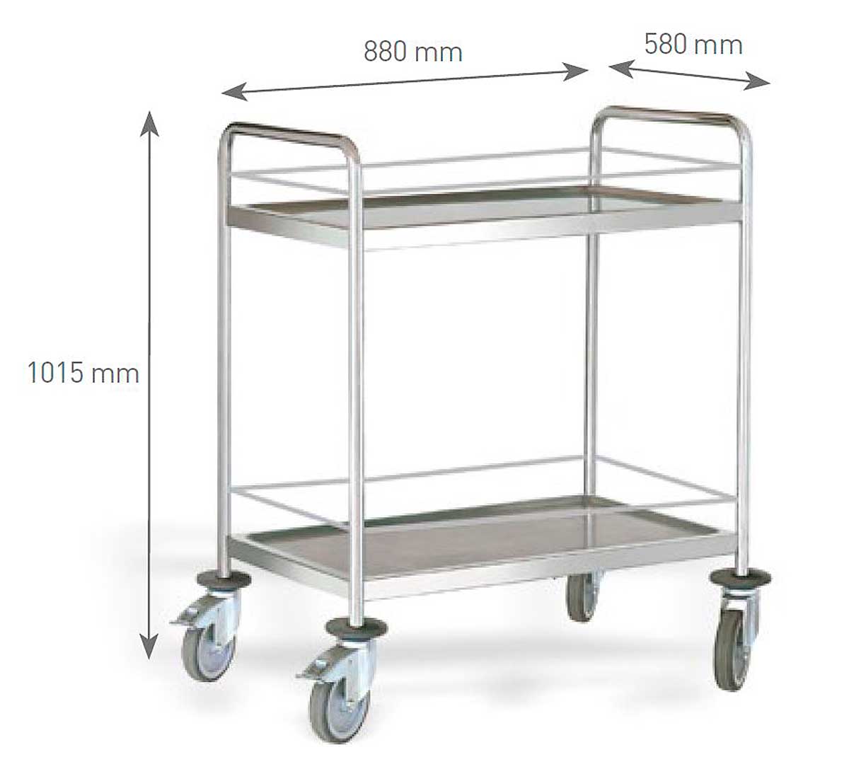 El Carro de Servicio con Barandilla y 2 Estantes de Pujadas está fabricado en acero inoxidable.