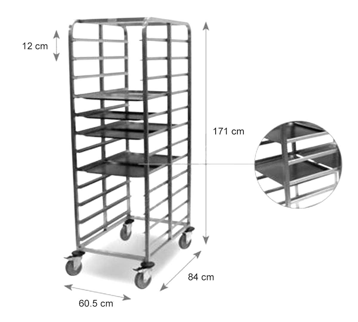 Este carro porta bandejas está disponible con ruedas poliamida con un coste extra. Consúltanos para más información.