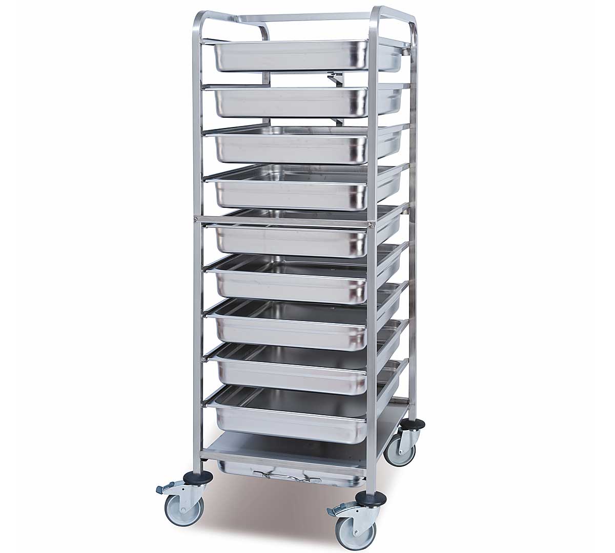 Este carro porta bandejas está disponible con ruedas poliamida con un coste extra. Consúltanos para más información.