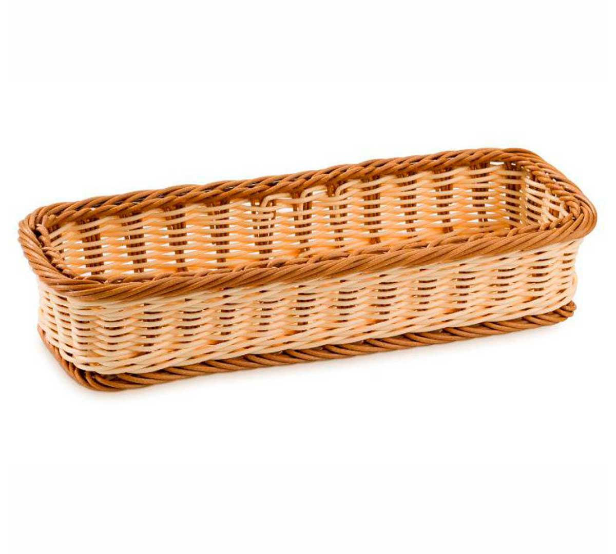 Cesta rectangular para cubiertos fabricada en polipropileno. Está disponible en color marrón claro con los bordes más oscuros o marrón oscuro. Mide 30 cm de ancho, 11 cm de fondo y 7 cm de alto.
