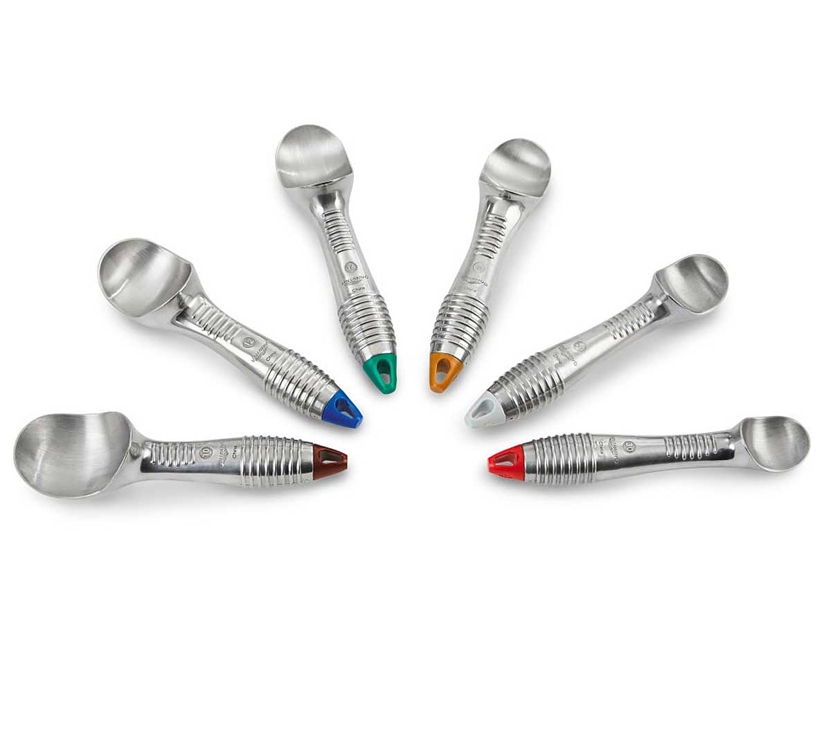 Cuchara para helado de aluminio con diseño ergonómica y mano texturizado para un mejor agarre. Con orificio para colgarse. Está disponible con el borde del mango en seis colores.