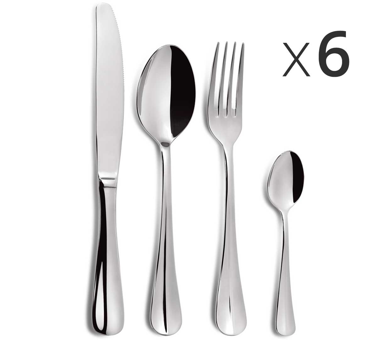 El juego de 24 piezas incluye: 6 tenedores de mesa, 6 cucharas de mesa, 6 cuchillos de mesa y 6 cucharas de café.