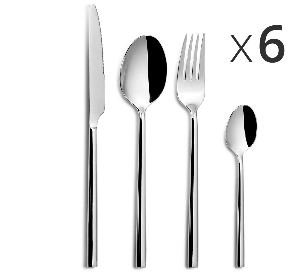 El juego de 24 piezas incluye: 6 tenedores de mesa, 6 cucharas de mesa, 6 cuchillos de mesa y 6 cucharas de café.