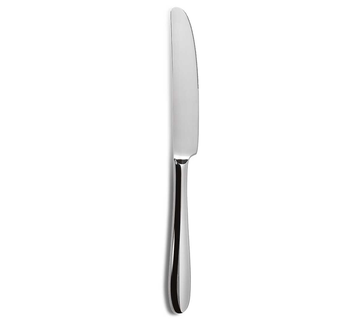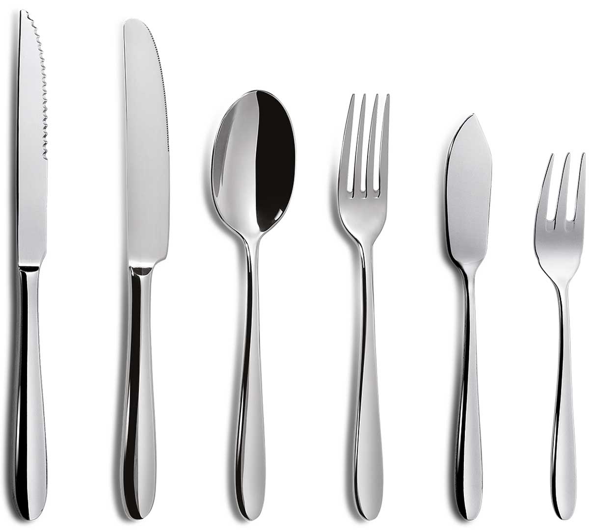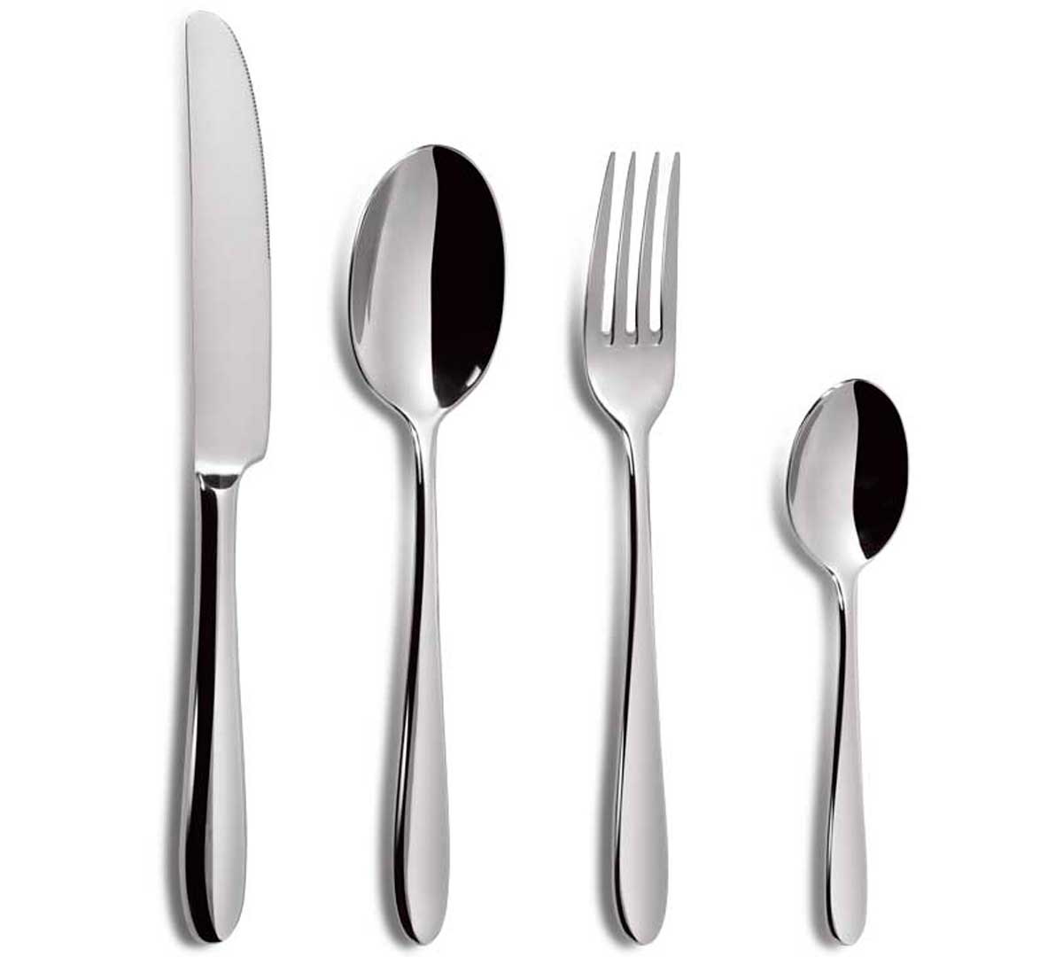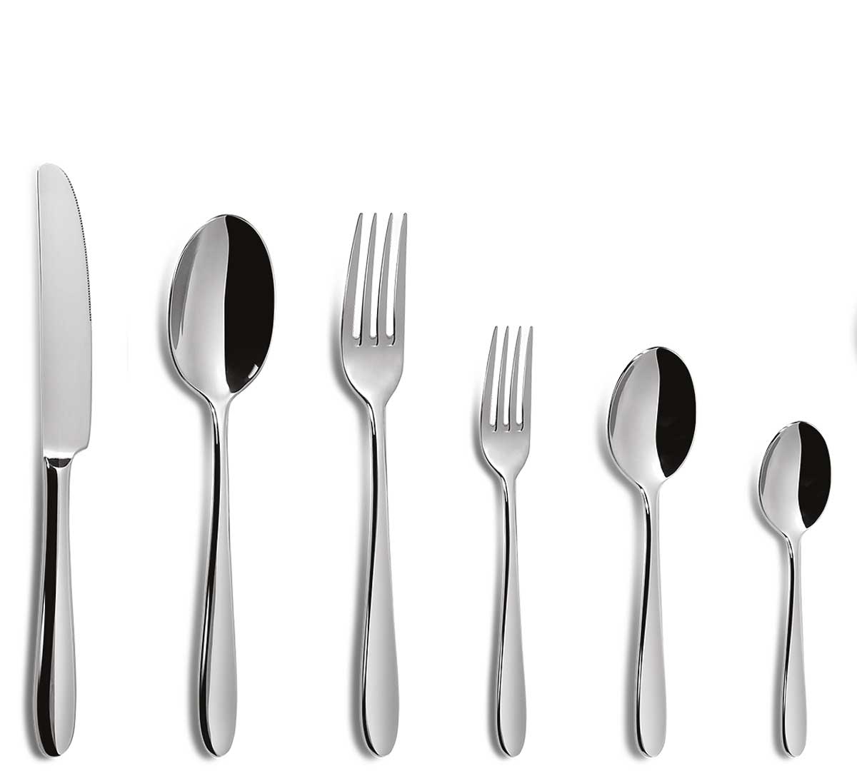 Cubertería fabricada en acero inox 18/10, con Níquel. Acabado espejo. La colección se compone de 13 piezas diferentes. Cada tipo de cubierto se puede adquirir por separado en pack de 12 unidades. O bien en juegos completos de 16, 24 o 30 piezas. Tiene un espesor de 4 mm.