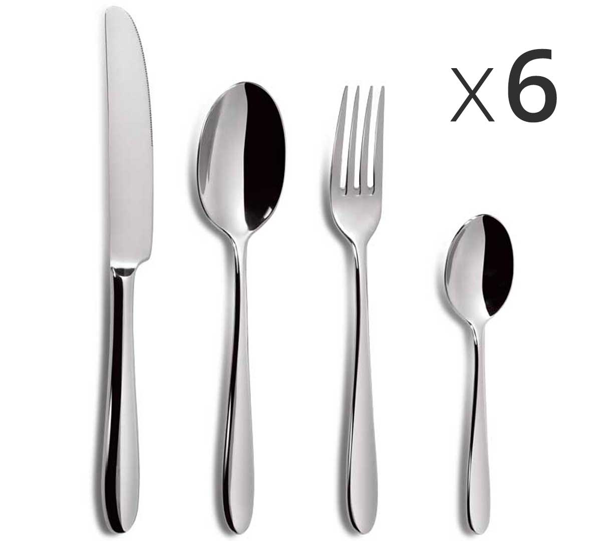 El juego de 24 piezas incluye: 6 tenedores de mesa, 6 cucharas de mesa, 6 cuchillos de mesa y 6 cucharas de café.