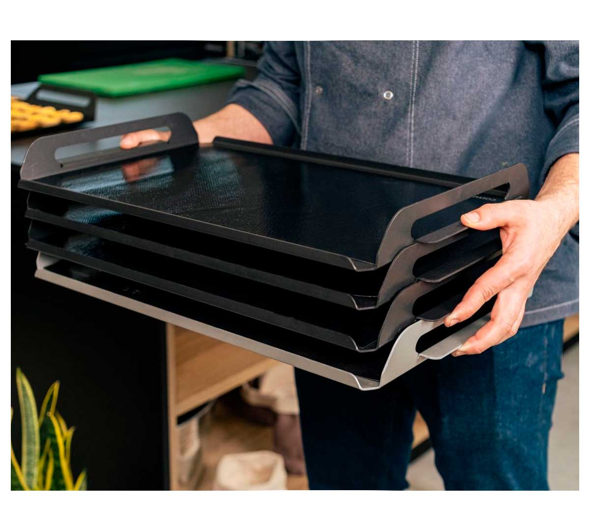 De diseño apilable, con una altura entre bandejas de 7,4 cm.