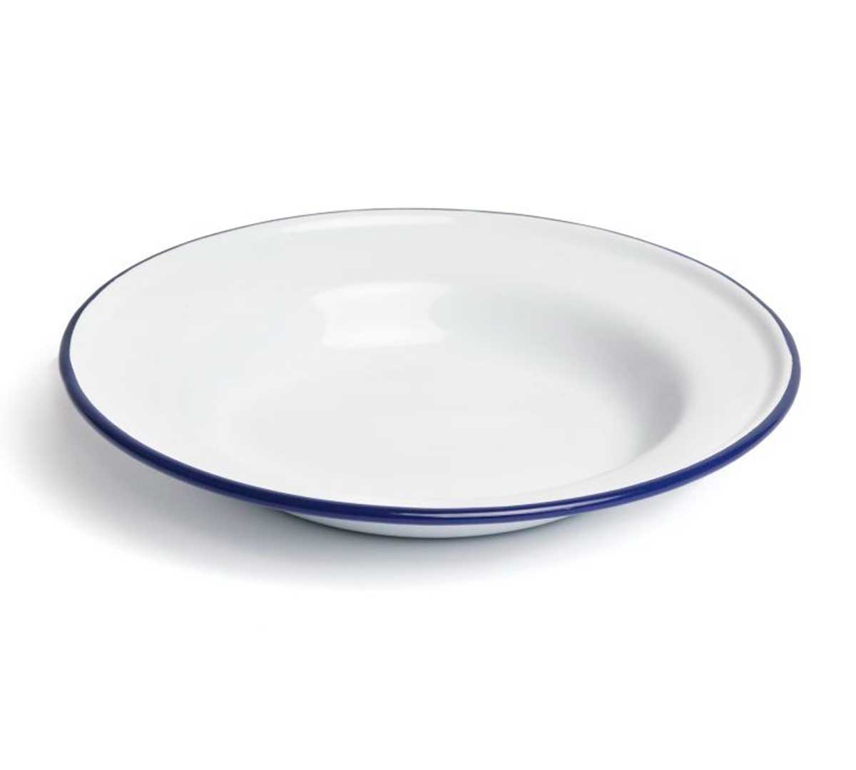El Plato Hondo Peltre de Comas está fabricado en hierro esmaltado. Es de color blanco con el borde azul.