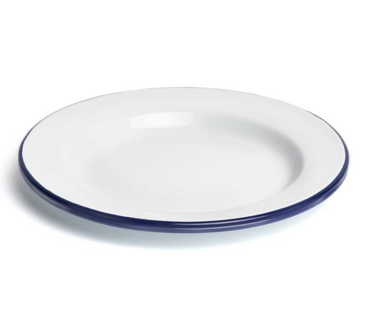 Plato llano fabricado en hierro esmaltado. Tiene un diámetro de 26 cm y un alto de 2 cm. Puede utilizarse en el horno hasta 250 ºC. En color blanco con el borde azul.