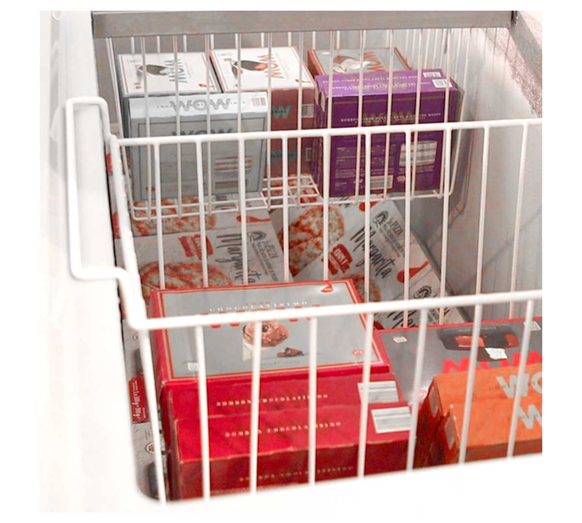 Congelador horizontal con puerta opaca abatible.