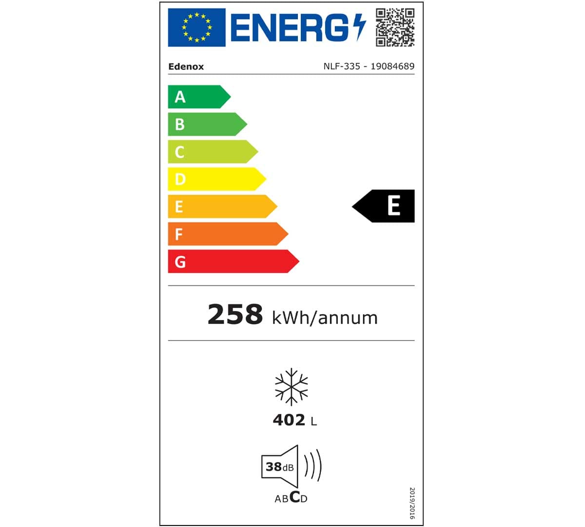 El arcón congelador NLF-335 tiene etiqueta de eficiencia energética clase E, según el reglamento UE 2019/2016.