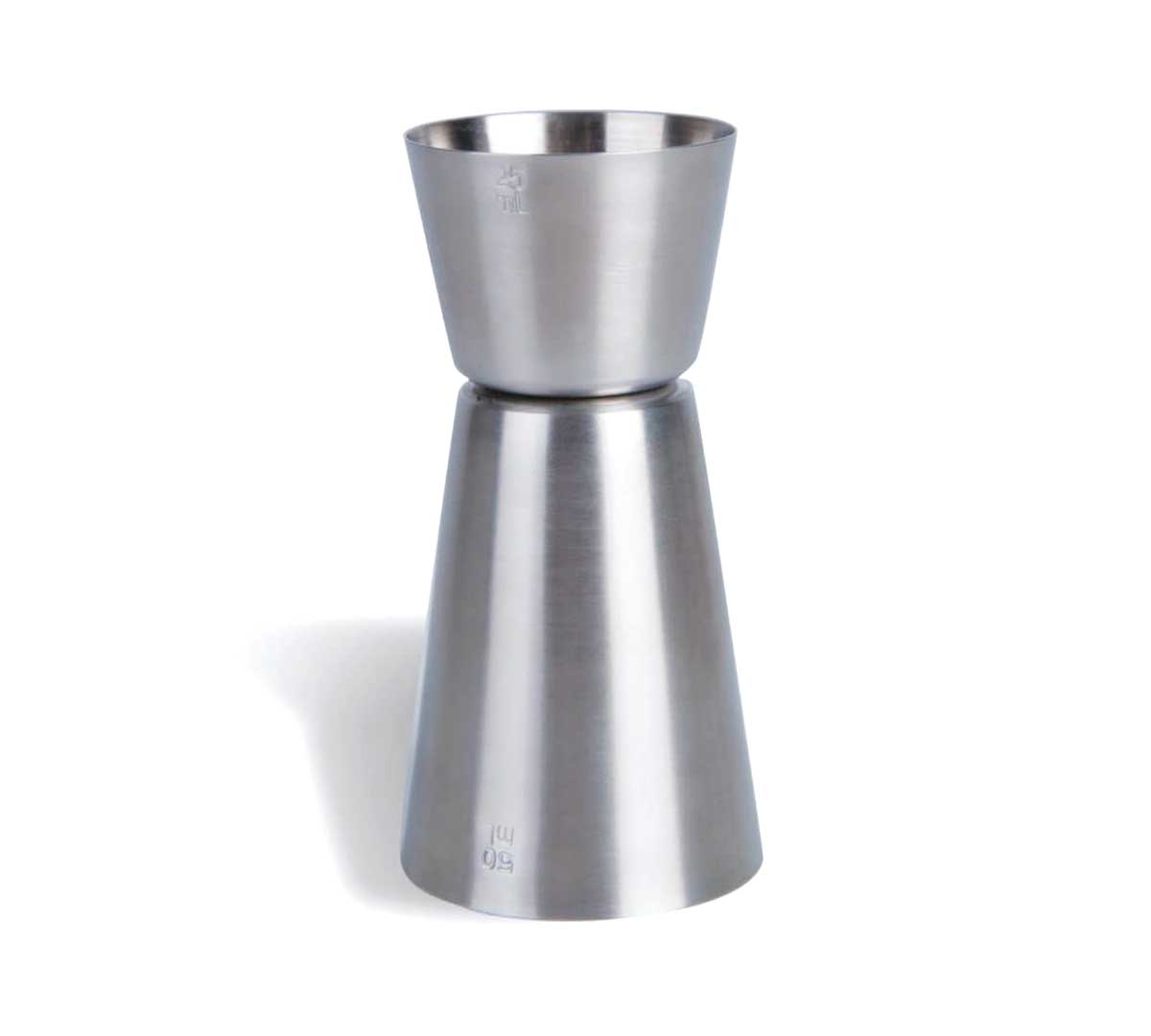 Dosificador para licor de acero inoxidable. Permite medir con precisión la cantidad de licor al preparar cócteles. Tiene 2 dosificadores. Uno con diámetro de 3,7 cm, alto de 2,8 cm y capacidad de 25 ml. Otro con diámetro de 4,1 cm, alto de 5,7 cm y capacidad de 50 ml.
