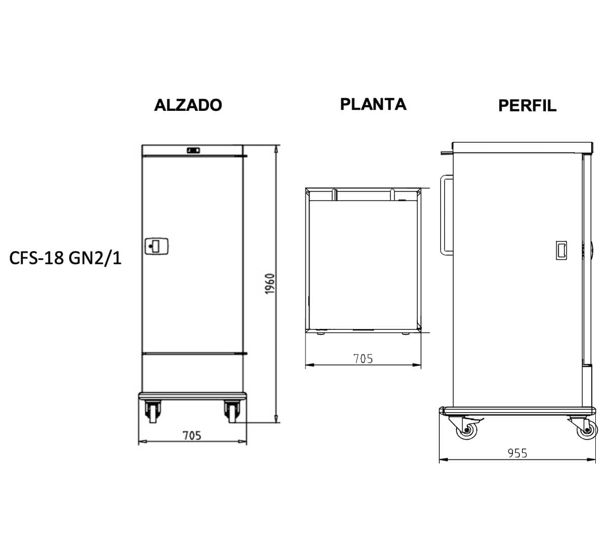 El carro refrigerado CFS-18 GN2/1 tiene un diseño compacto y de gran capacidad. Tiene una temperatura de trabajo de 0/+12 ºC. Permite almacenar hasta 18 bandejas GN 2/1.