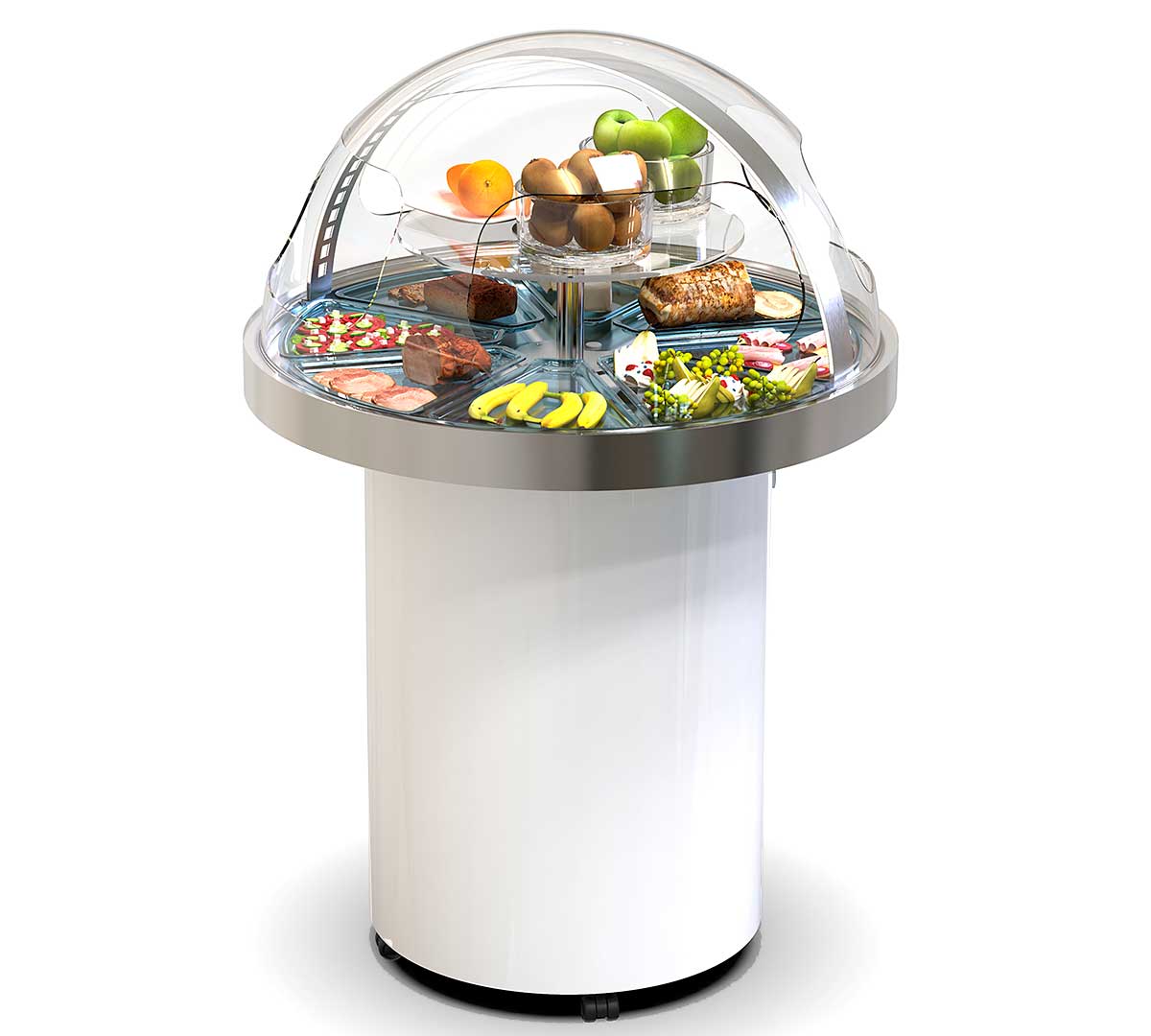 Vitrina refigerada con un espectacular diseño circular. Ideal para buffets. Sus dimensiones reducidas le aportan mayor versatilidad. Está fabricada en acero inoxidable con estante intermedio y una cúpula de metacrilato.