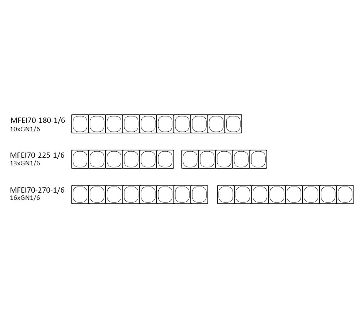 Incluye 3 estantes GN 1/1 de alambre en acero plastificado y 3 pares de guías.
