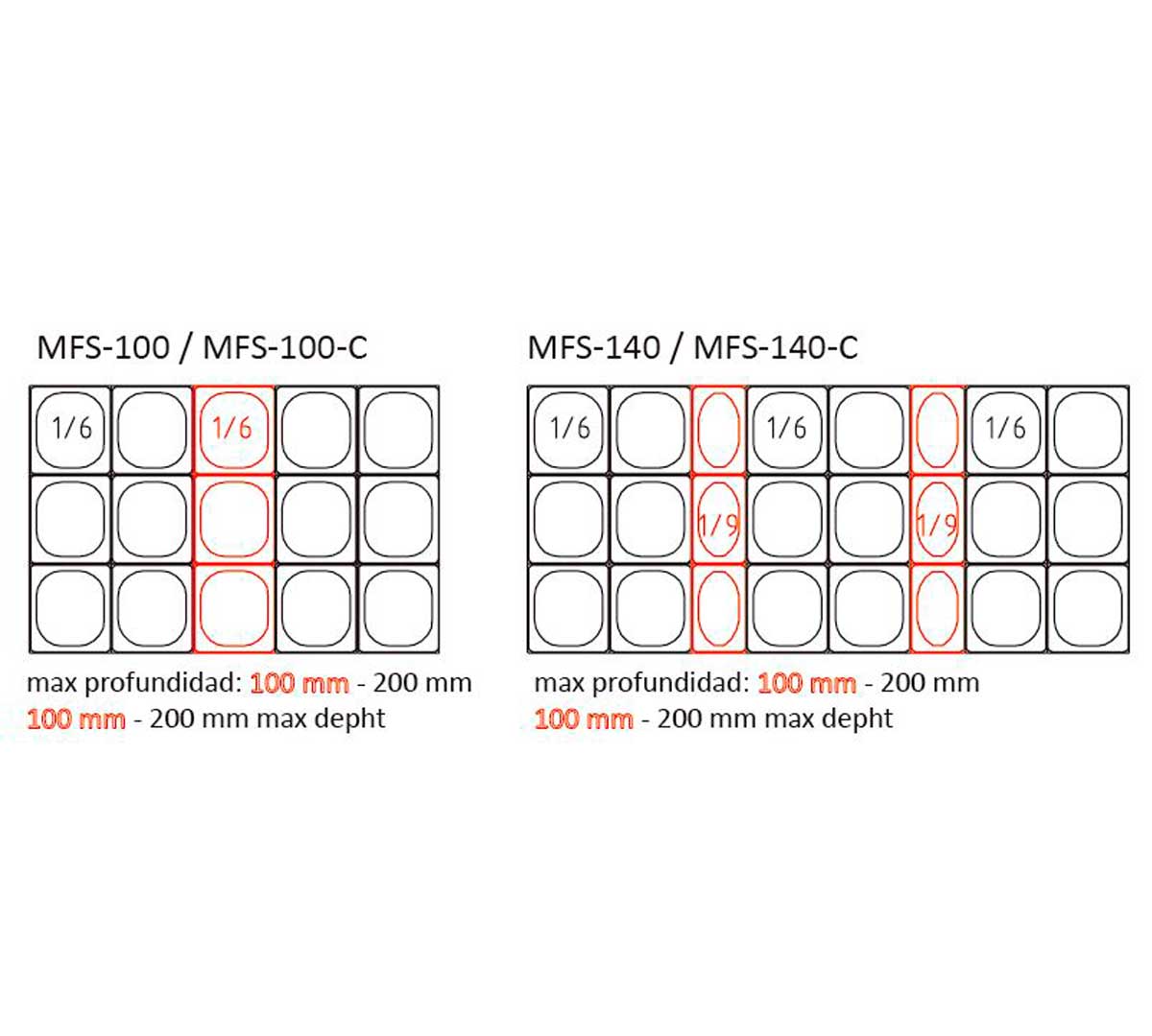 El expositor de ingrediente tiene capacidad para 15 cubetas GN 1/6 con una profundidad de 20 cm excepto la fila central que tiene una profundidad de 10 cm.
