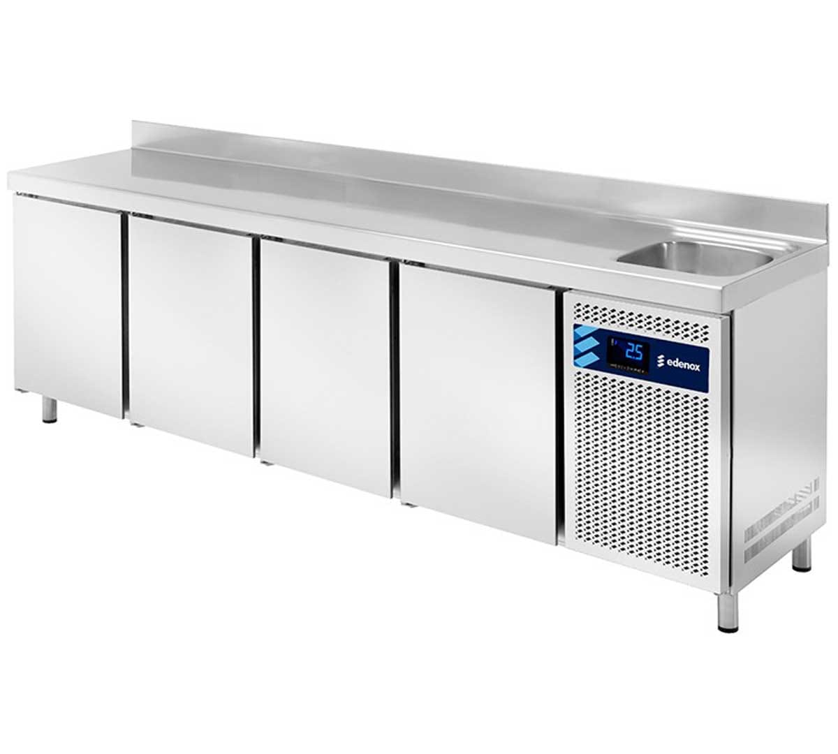 La Mesa Refrigerada Snack con Fregadero MPSF de Edenox de Edenox está fabricada en acero inoxidable y utiliza gas refrigerante ecológico para minimizar el impacto del consumo. Incorpora sistema de ventilación y condensación frontal, lo que les permite aspirar y expulsar aire por delante, asegurando un óptimo rendimiento incluso en espacios encajonados.