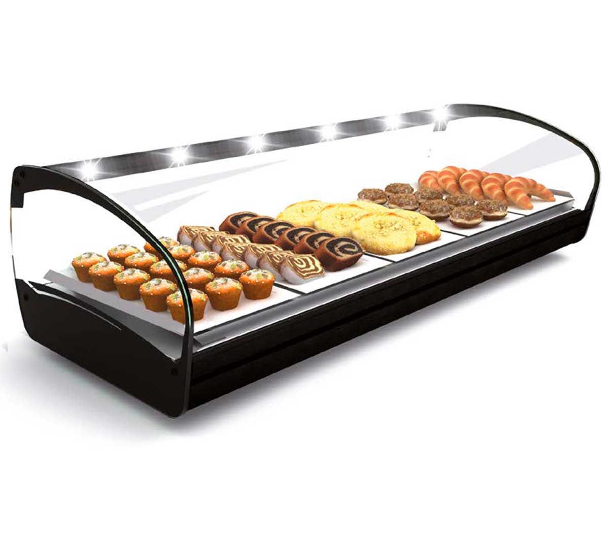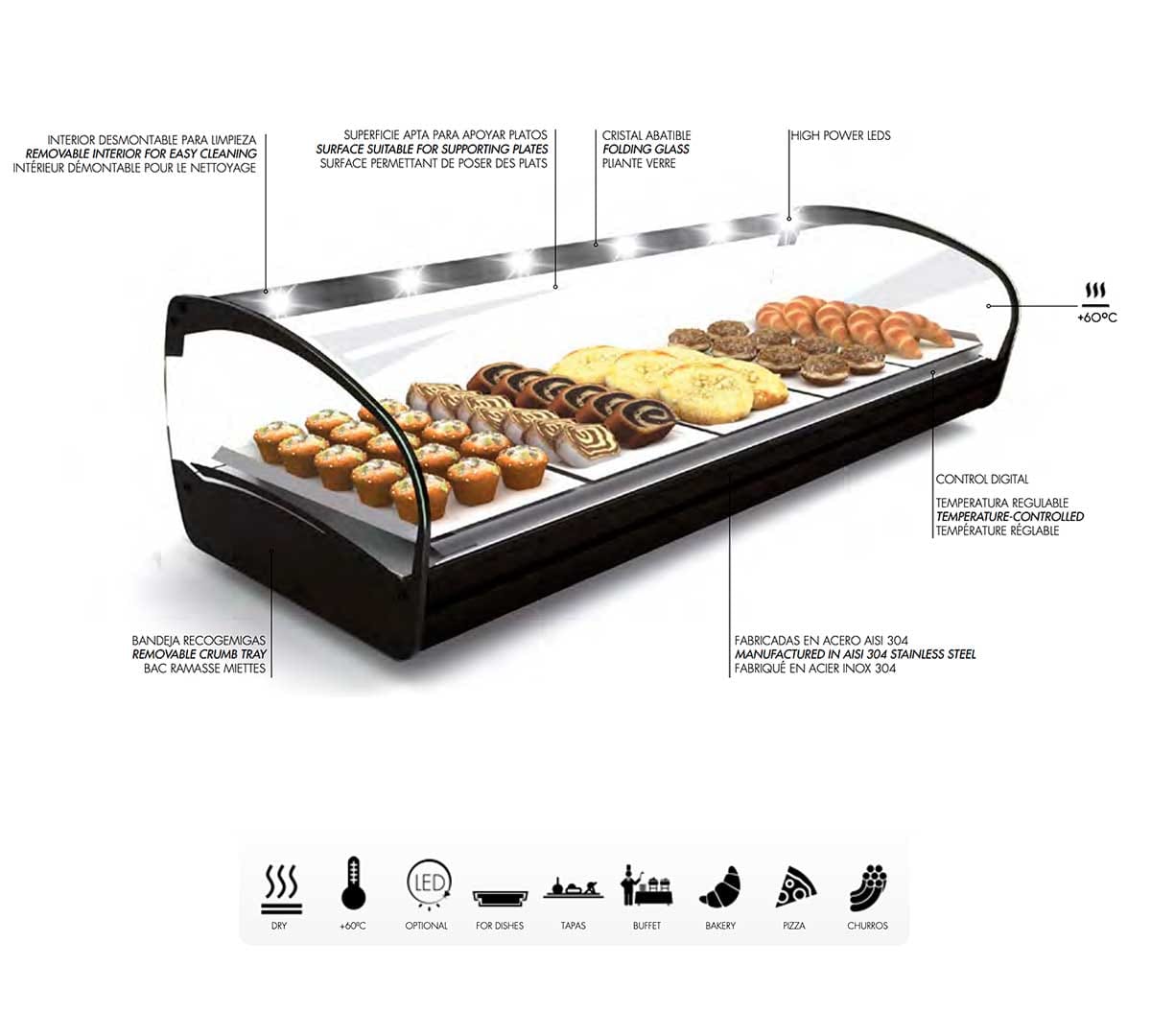 La Vitrina Caliente Shark Sahara 1 Piso de Sayl tiene cristal curvo abatible y la superficie superior es apta para apoyar platos. Diseñada para mantener calientes productos como bocadillos, bollería, tapas, etc.