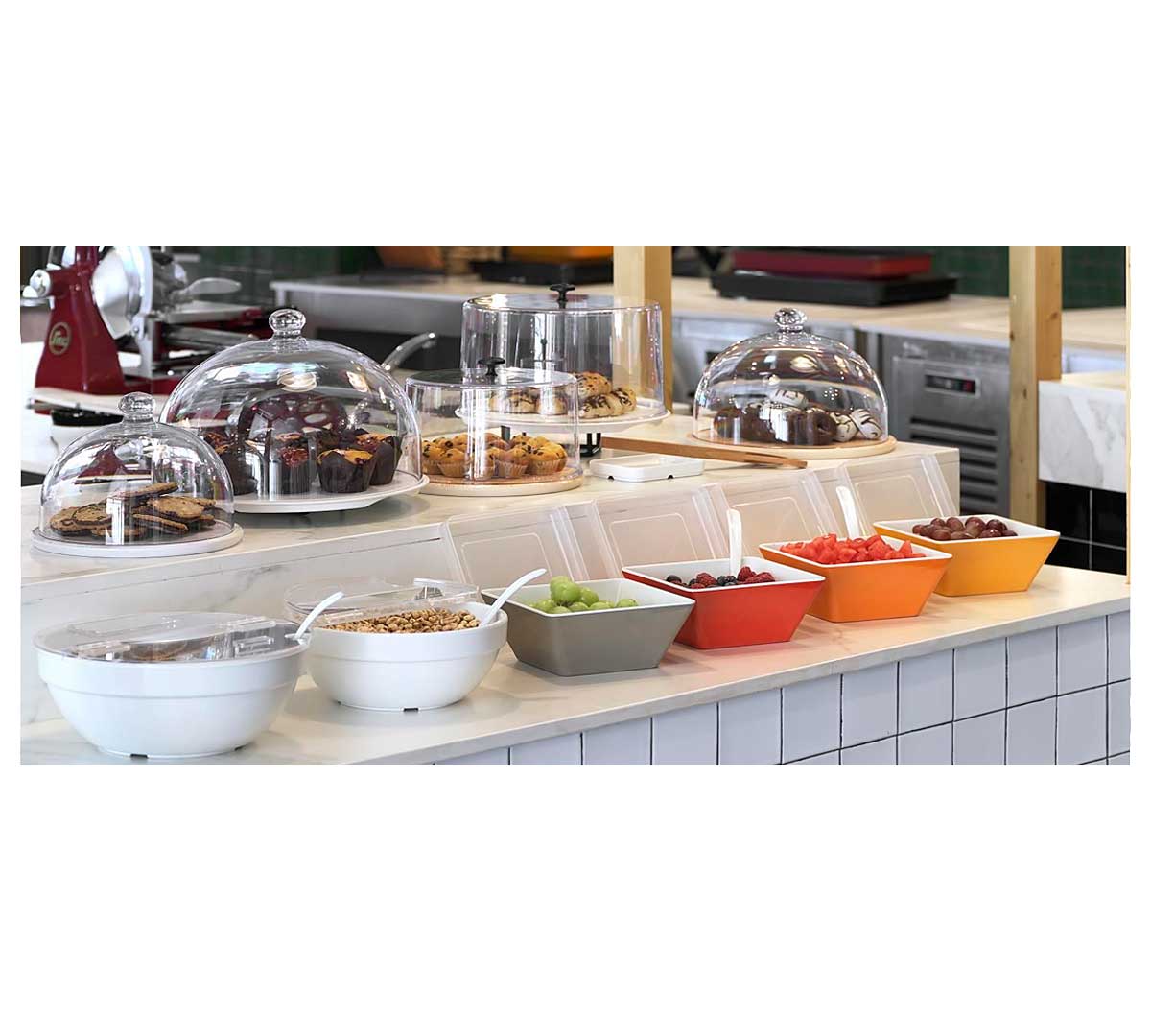 Compatible con el expositor buffet de melamina en color blanco.