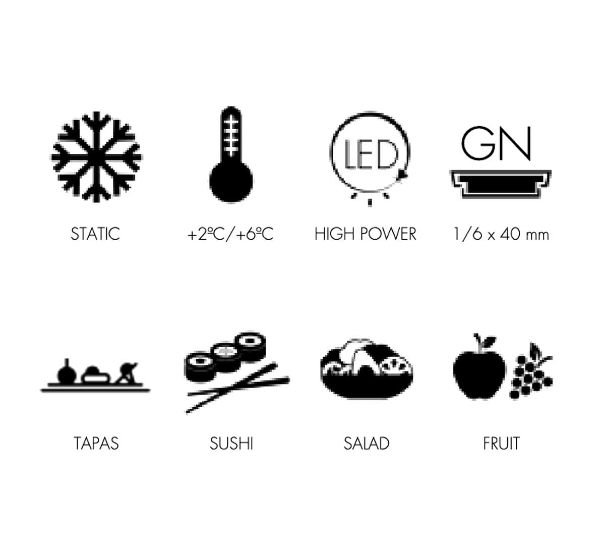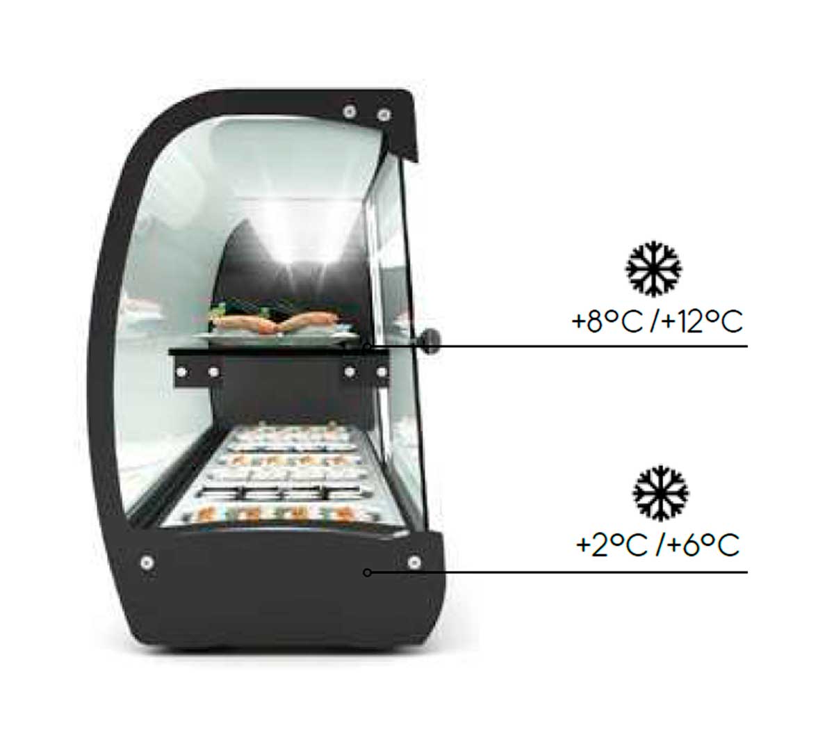 Esta vitrina pertenece a la serie Slim en versión refrigerada. Destaca por tener doble frío con evaporador estático. La placa y el estante son refrigerados. Está recomendada para sushi, tapas, ensaladas y frutas.