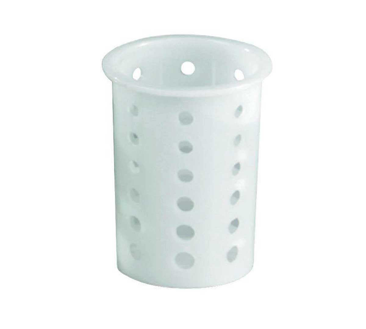 Cestillo para cubiertos redondo diseñado para el lavado, almacenamiento y transporte de cubiertos. Tiene los laterales abiertos y es de color blanco. Con un diámetro de 9,5 cm y un alto de 14,5 cm.