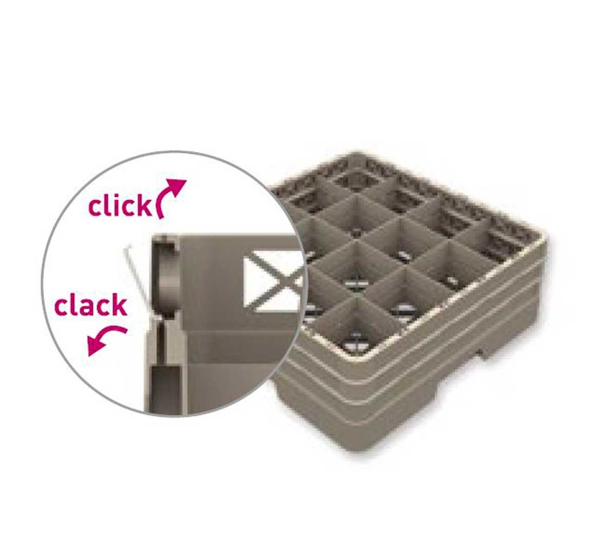 Sistema que permite cerrar y abrir las paredes de las cestas y extensiones fácilmente. Identificador de colores para cestas y extensiones completamente cerradas. Está disponible en 6 colores: marrón, burdeos, azul, amarillo, verde y marrón oscuro.