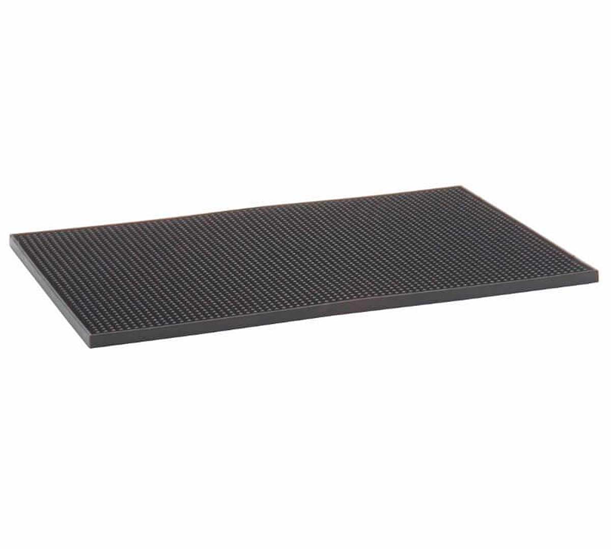 Alfombra rectangular para escurrir vasos y copas fabricada en caucho termoplástico flexible y en color negro. Mide 45,7 cm de ancho y 30,5 cm de fondo. Tiene un grosor de 1,3 cm.