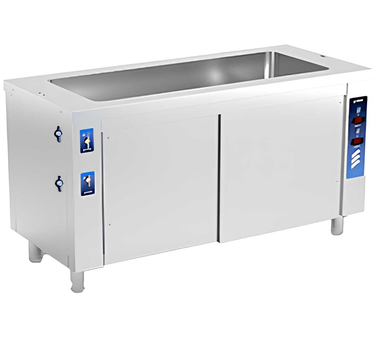 El Mueble Baño María MBM Neutra de Edenox, cuenta con reserva inferior neutra y calentamiento indirecto del agua mediante resistencias de silicona colocadas en la parte inferior de la cuba. Las resistencias de silicona mejoran el rendimiento y reducen el consumo eléctrico.
