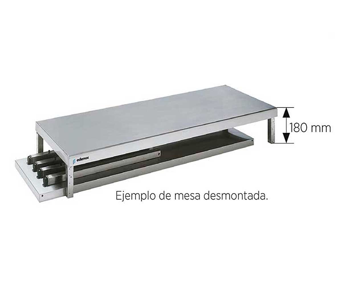 La Mesa de trabajo Central Gama 500 con 1 Estante de Edenox está fabricada en acero inoxidable con acabado satinado.