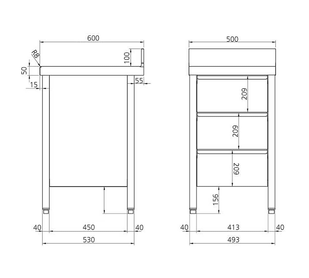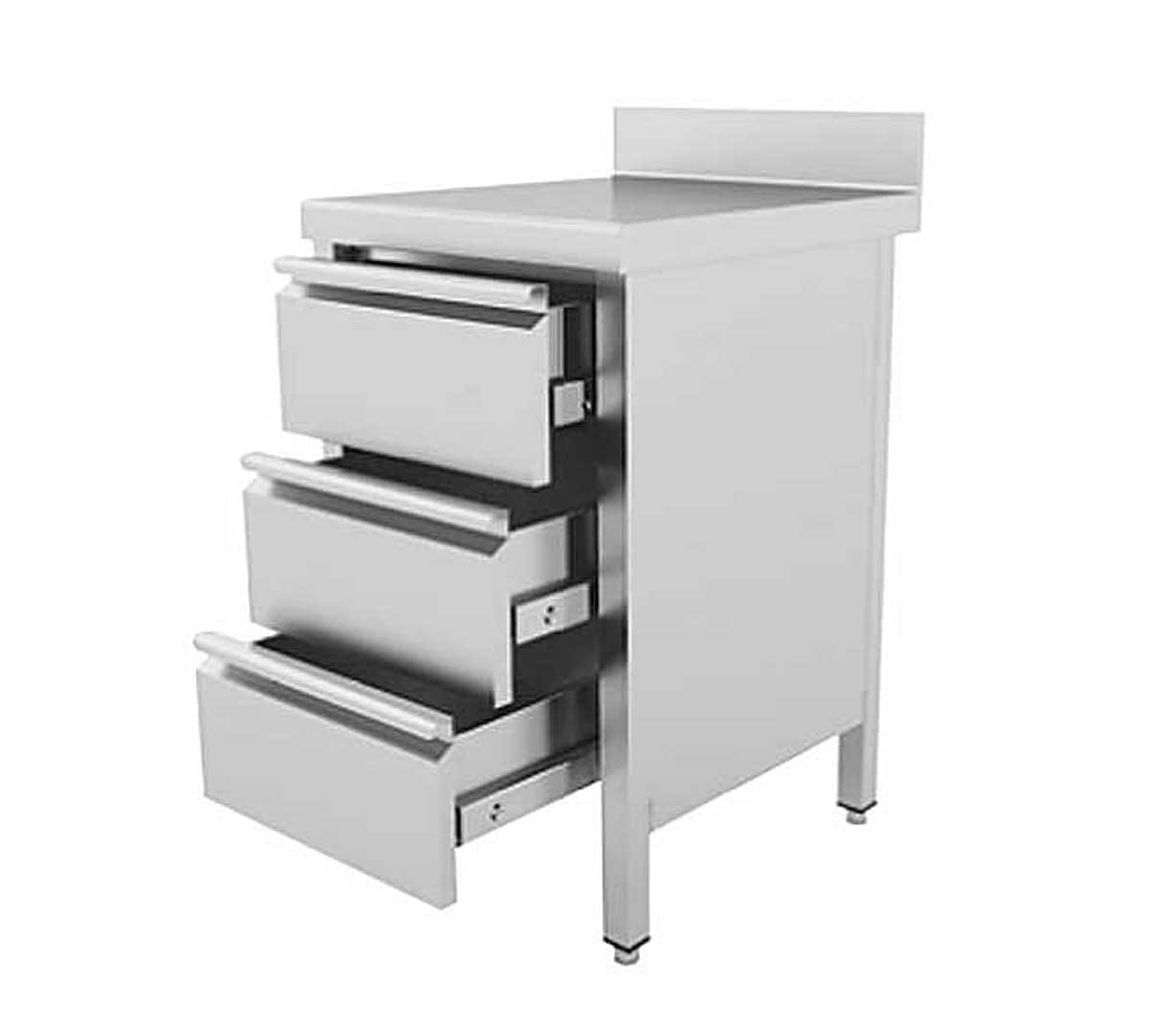 La Mesa Mural con 3 Cajones Gama 600 de Edenox está fabricada en acero inoxidable. Las dimensiones útiles de cada cajón son 42,4 x 36,5 x 12,8 cm.