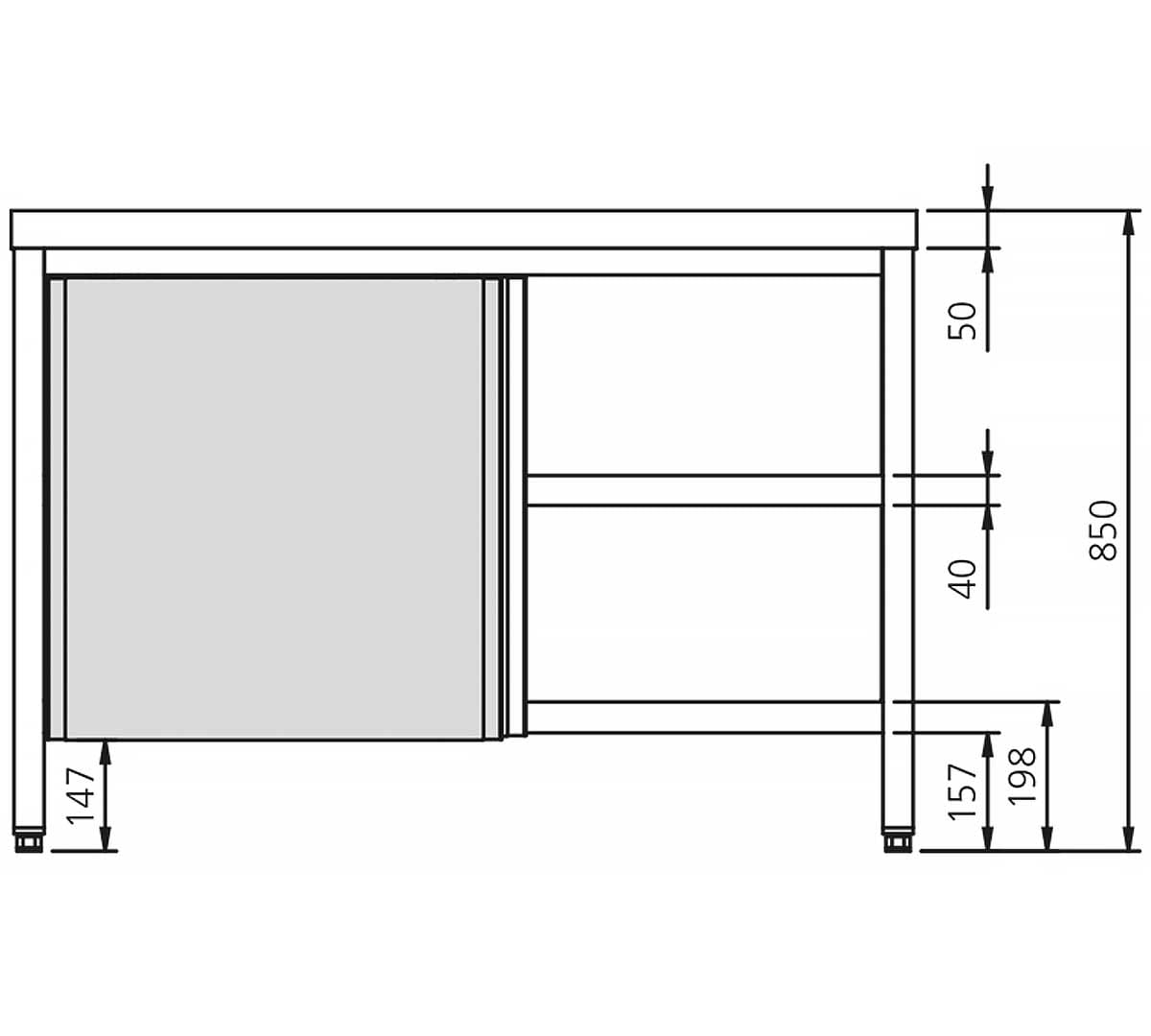 Mesa pasante con puertas correderas. Fabricada en acero inoxidable, con 1 estante intermedio ajustable en 7 niveles. Tiene un fondo de 60 cm y un alto de 85 cm. Disponible en 6 modelos.