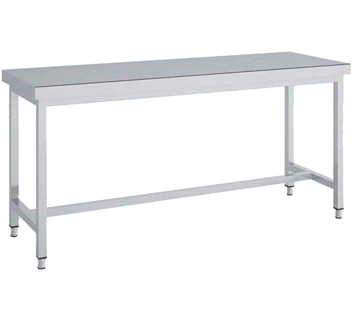 Mesa de trabajo central fabricada en acero inoxidable con acabado satinado sin estantes. Con refuerzo que le proporciona una excelente rigidez. Tiene un fondo de 70 cm y un alto de 85 cm.