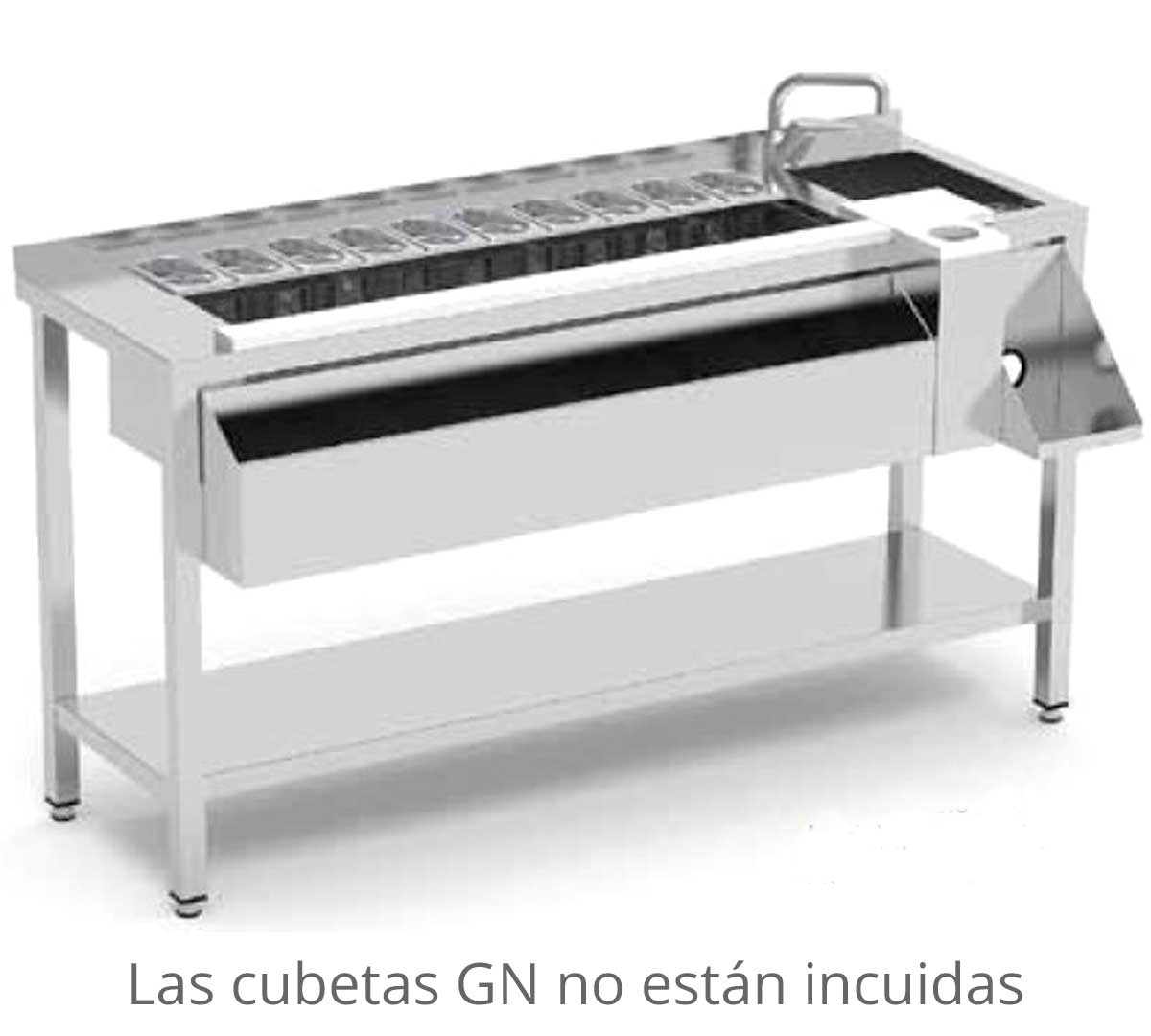 Capacidad cuba aislada: 2 zonas para hielo, 2 zona para botellas y 1 zona para 10 cubetas de GN 1/9-100 (cubetas no incluidas en el precio, ver kit opcional KC-120).