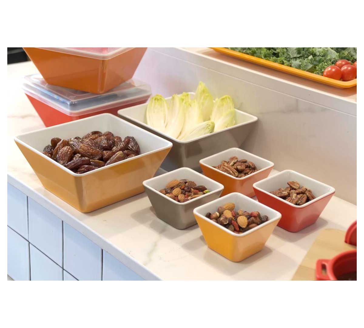 Bol Cuadrado Hondo, con medidas 9 x 9 cm. El interior es de color blanco y el exterior es de color naranja.